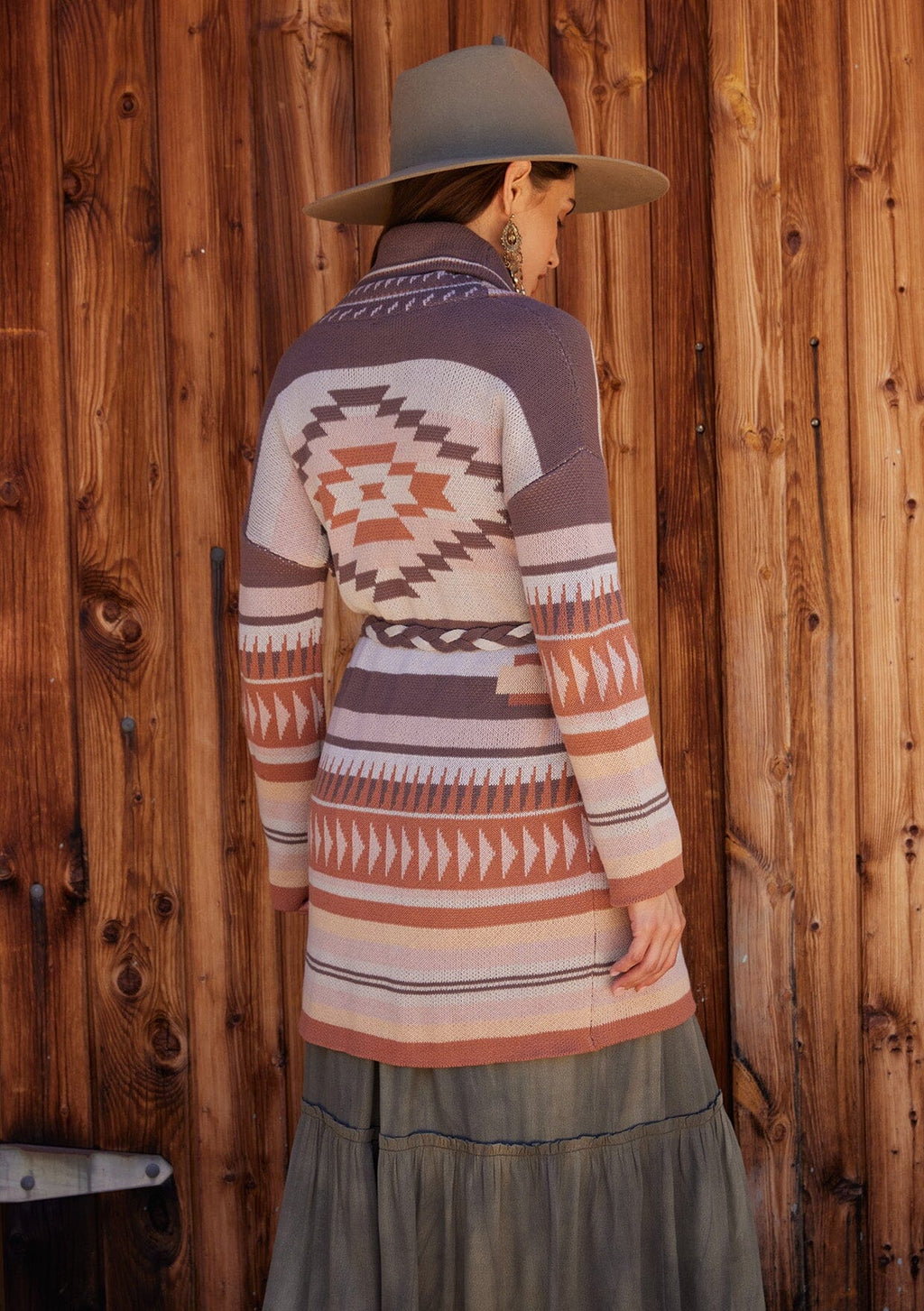 A cozy statement cardigan for fall and beyond, designed in a cool southwestern-inspired pattern. With a warm shawl collar, essential side pockets, and a bohemian braided belt. An effortless style that pairs well with denim.