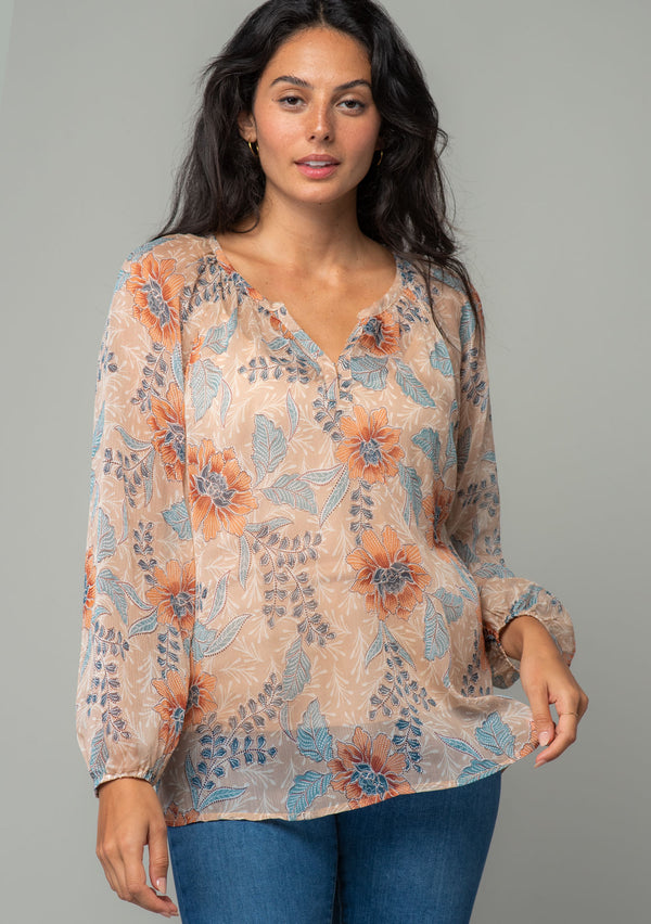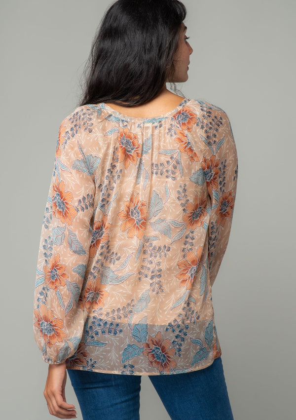[Color: Natural/Wine] A model wearing a sheer chiffon peasant top in a pink and natural mixed bohemian print. With long voluminous sleeves, a split neckline with tassel ties, and a button front.[Color: Natural/Wine] A model wearing a sheer chiffon peasant top in a pink and natural mixed bohemian print. With long voluminous sleeves, a split neckline with tassel ties, and a button front.