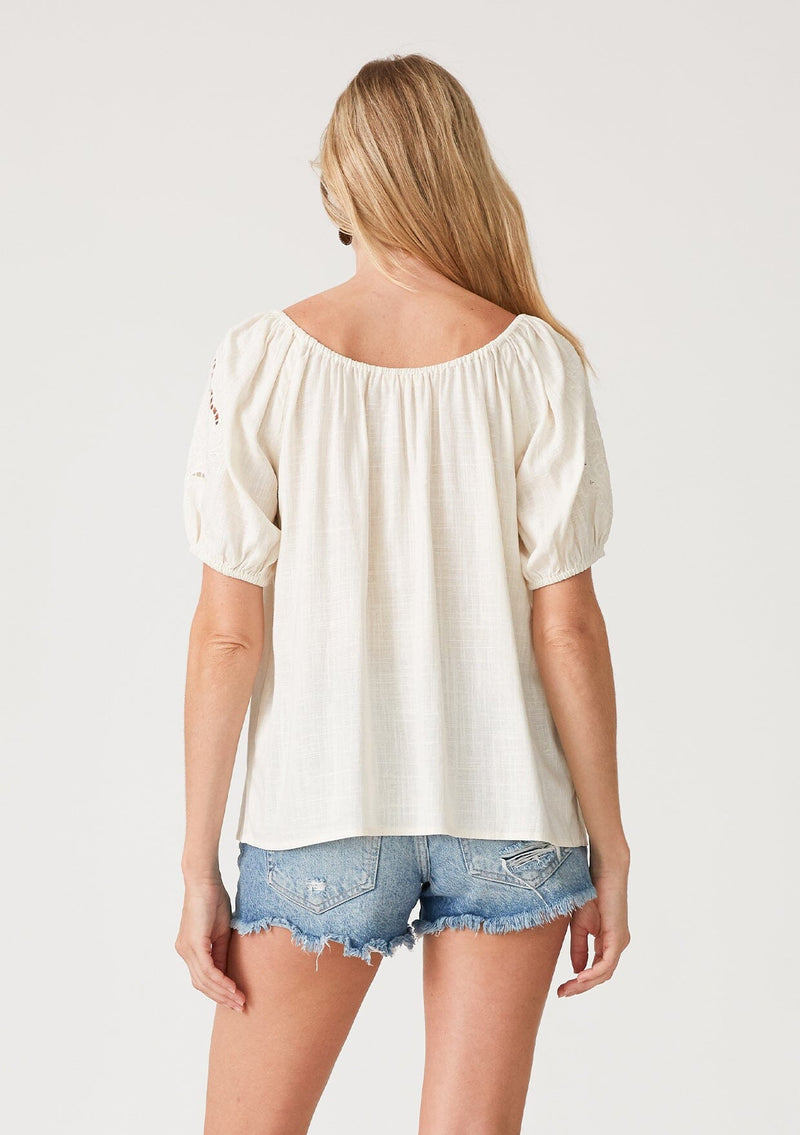 A relaxed, off-white bohemian puff sleeve top with embroidered detail.