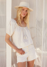 For the romantics at heart. Our simple and sweet resort top features short voluminous puff sleeves with delicate embroidered detail. The tie front scooped neckline features an adjustable drawstring with tassel ties.