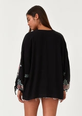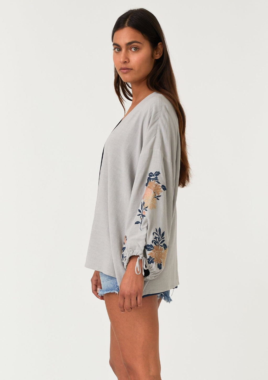 Pretty embroidered floral details add a unique touch to this classic bohemian kimono top. With voluminous long sleeves, adjustable drawstring wrist cuffs, and an open front. The contrast interior adds an elevated touch to this versatile cover-up style.