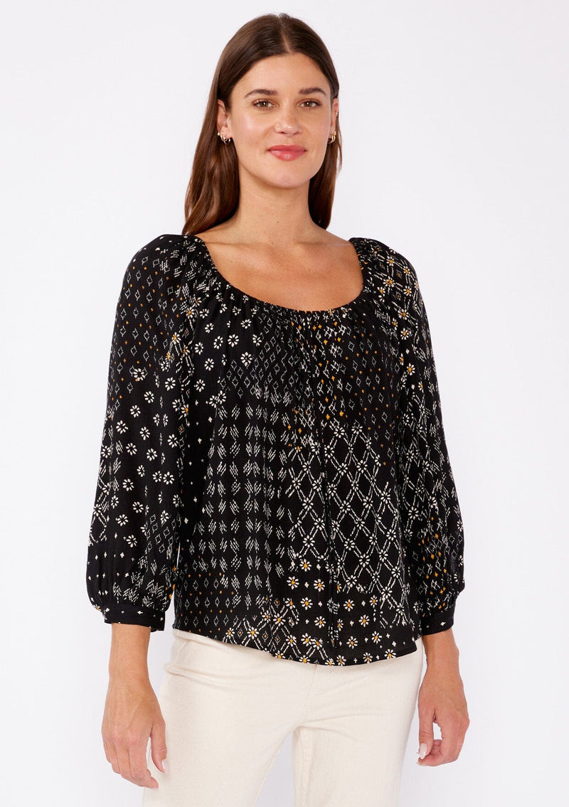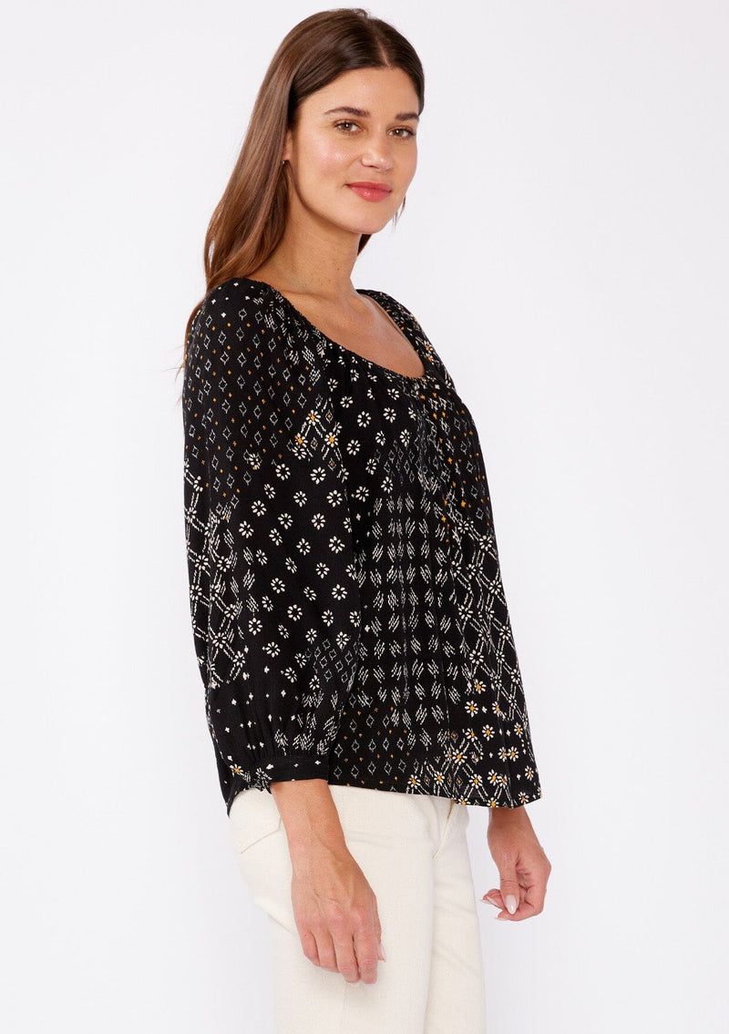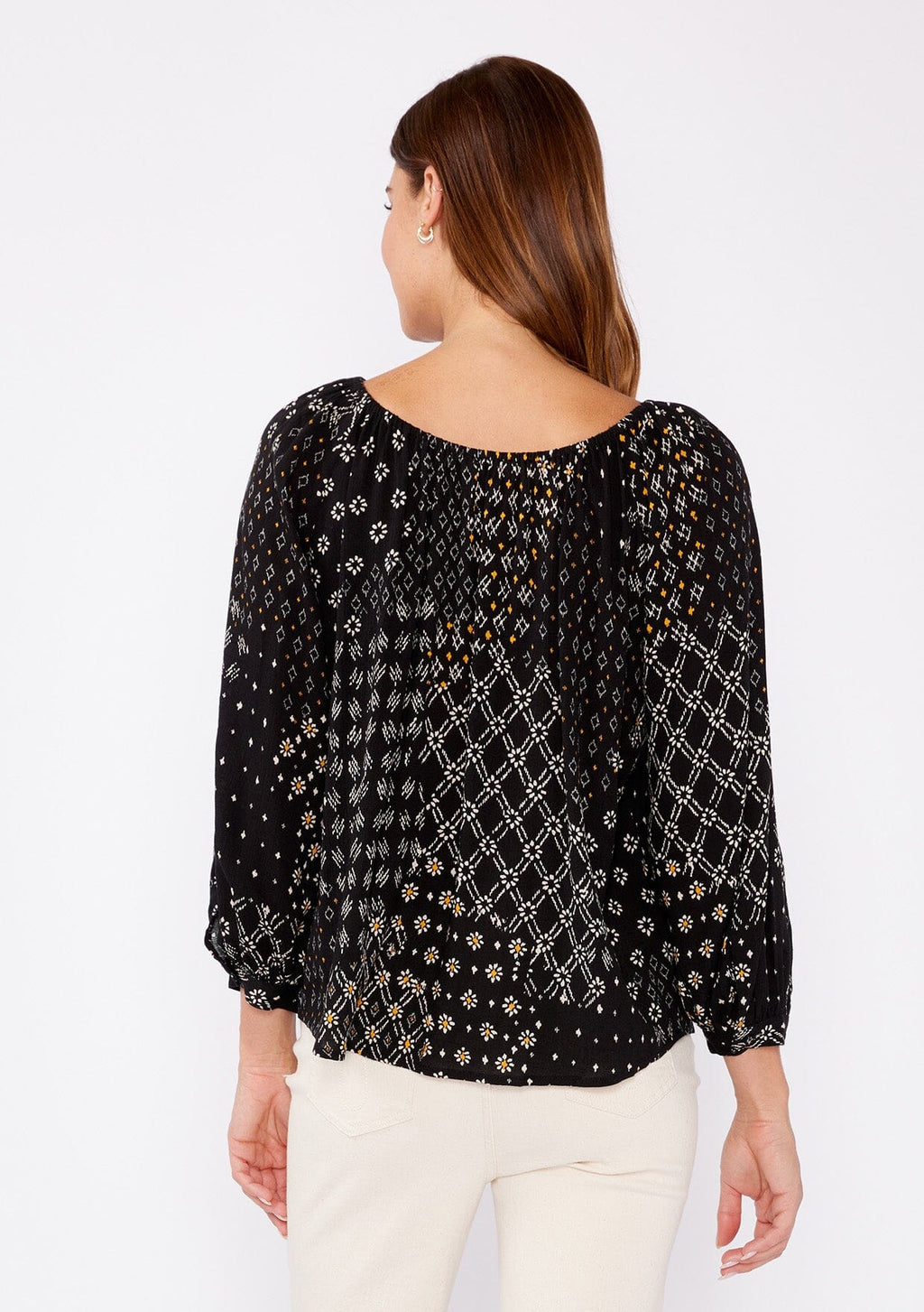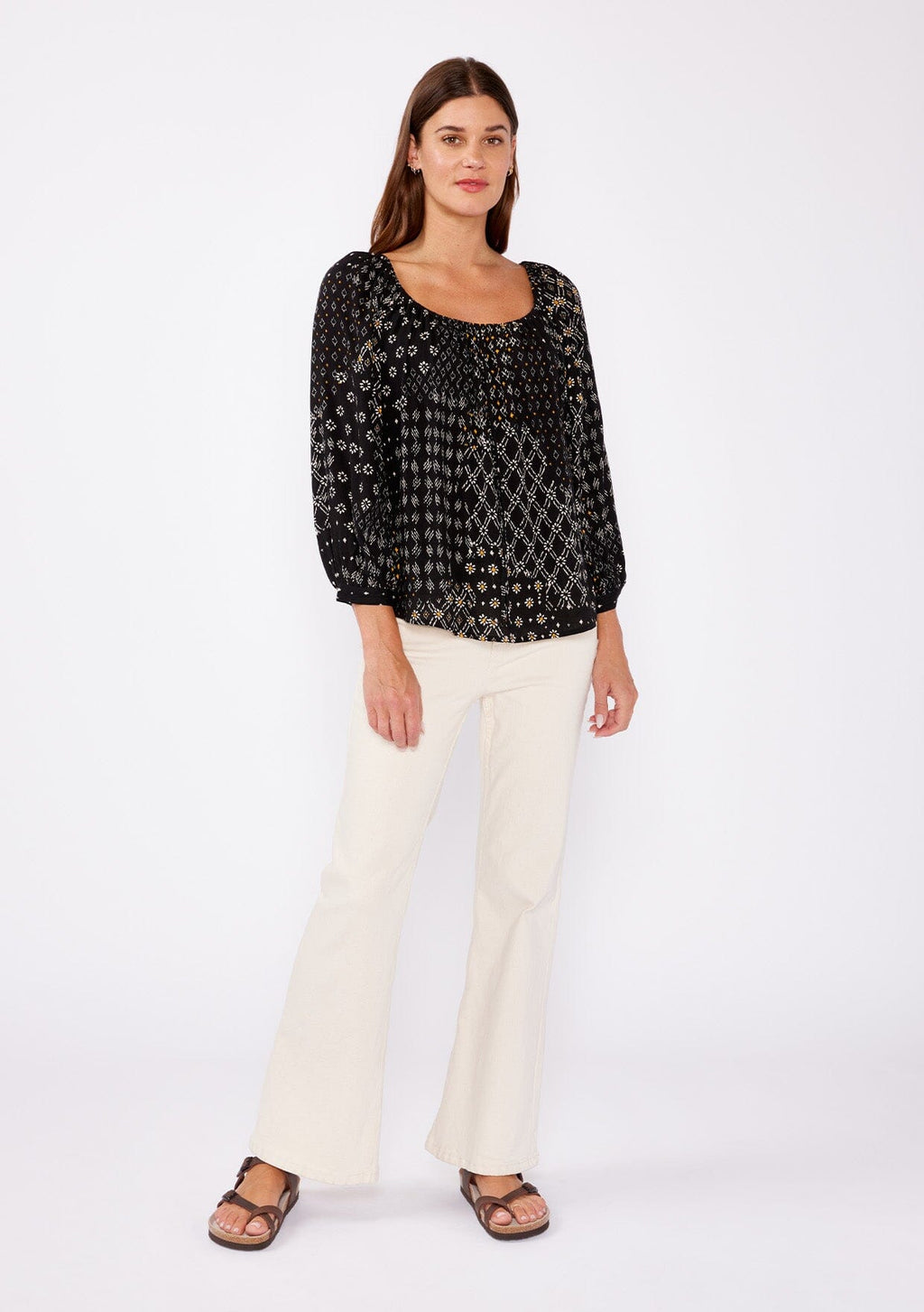 A flowy, long sleeve bohemian blouse in a black, mixed floral print.