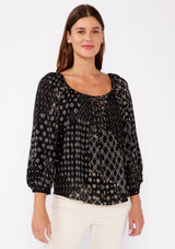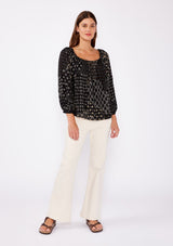 We love this effortless bohemian top for its ultra-flowy silhouette and voluminous long sleeves. Complete with a comfortable elastic neckline for versatile styling. This casual boho top is an easy throw-on-and-go style for the Fall season. Styled here with our GENUINS Dublin Apure Havana Sandal.