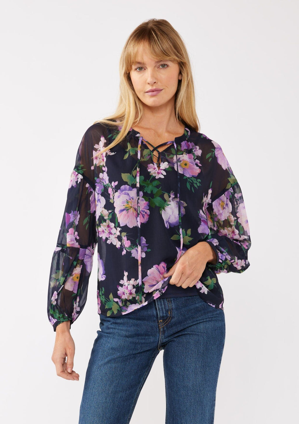A delicate sheer chiffon blouse with a navy and purple floral print
