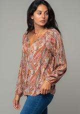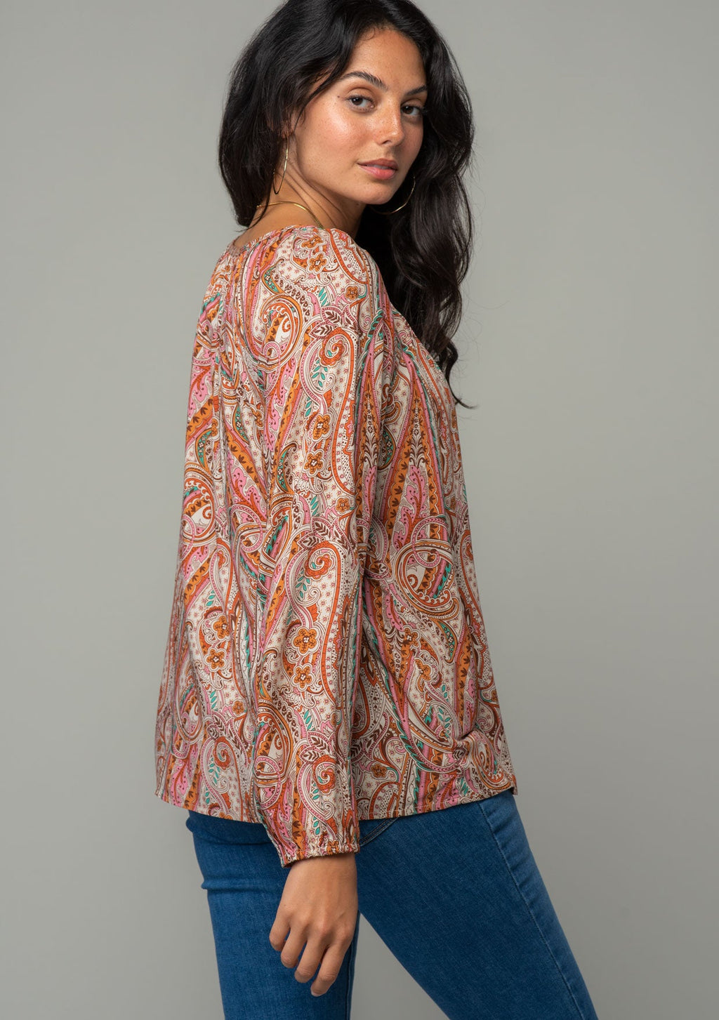 This classic peasant blouse is designed in a vintage-inspired paisley print. With voluminous long raglan sleeves, a front keyhole with optional button loop closure, and a flattering flowy fit. We love to pair this effortless style with our favorite vintage denim.