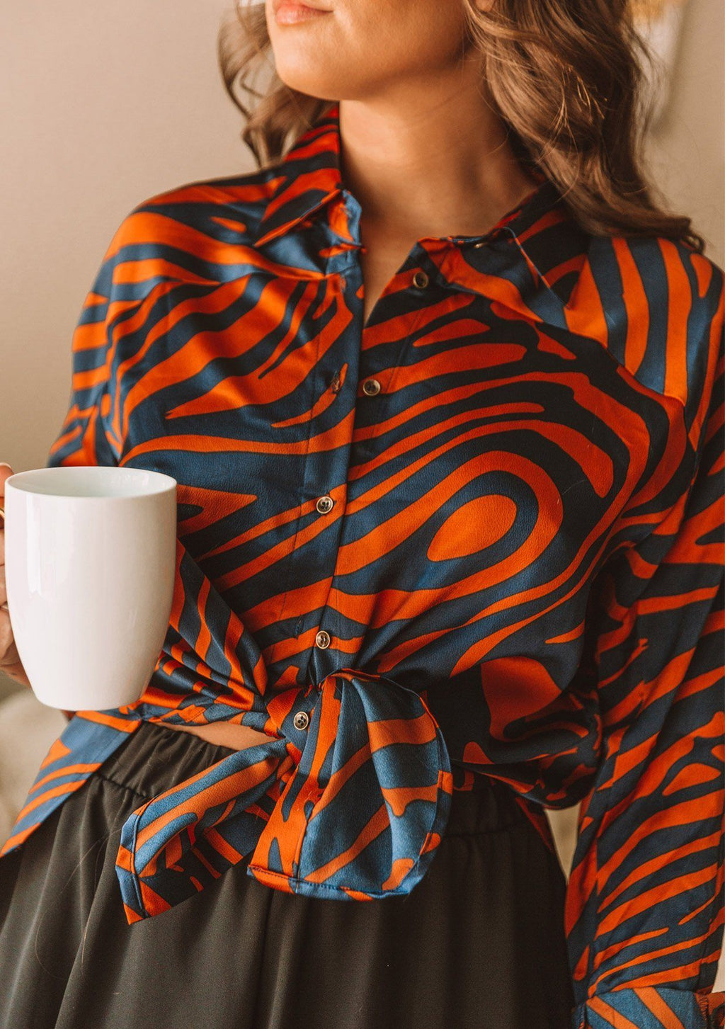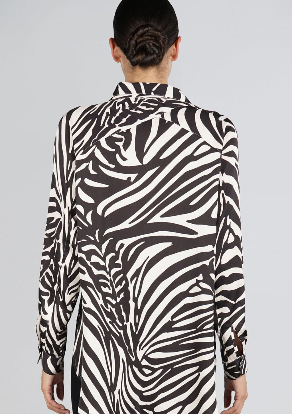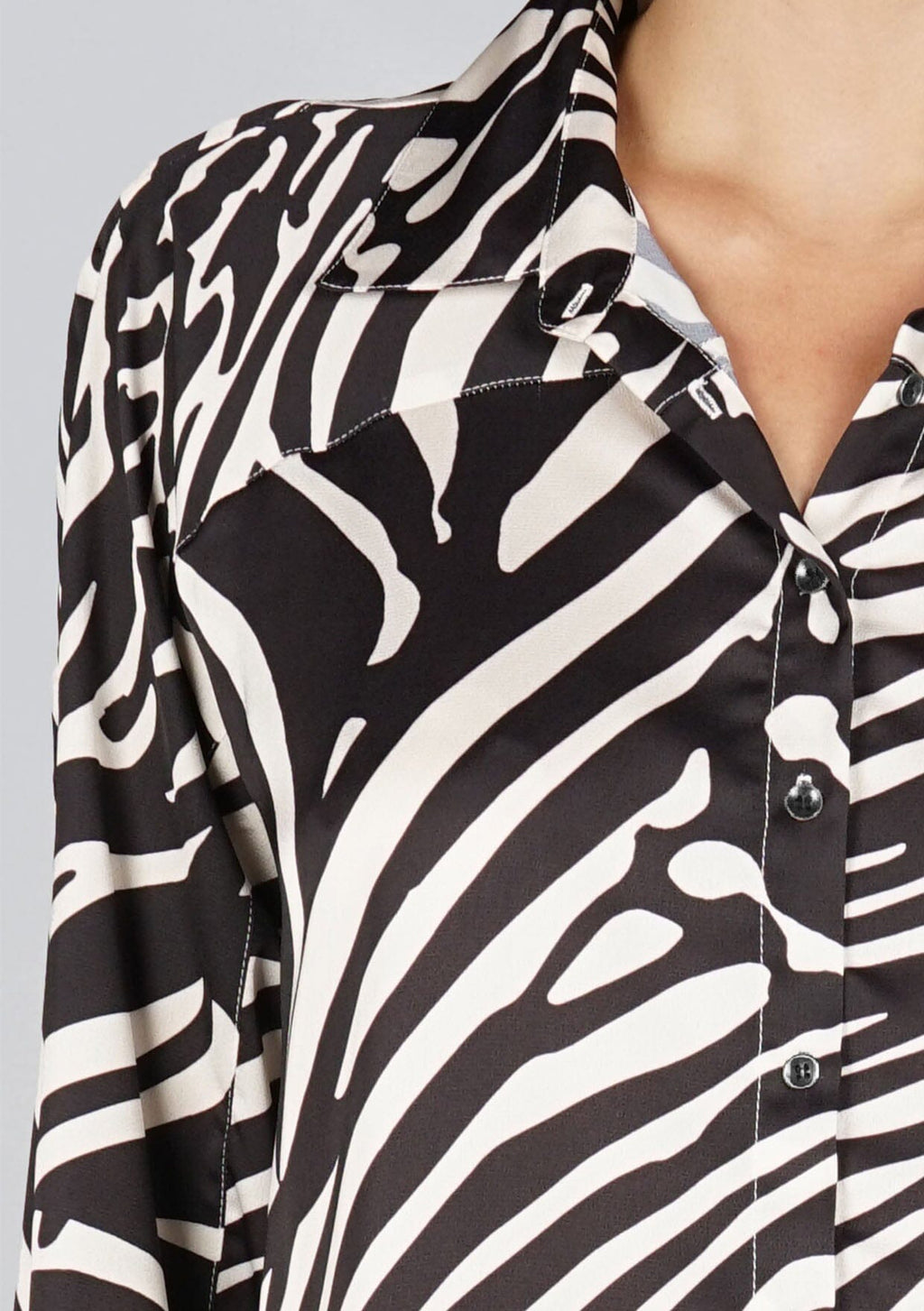 For those who want to stand out, our soft and silky button-up shirt is designed in a bold zebra print. Featuring a classic shirttail hemline and a unique diagonal yoke detail in the back.