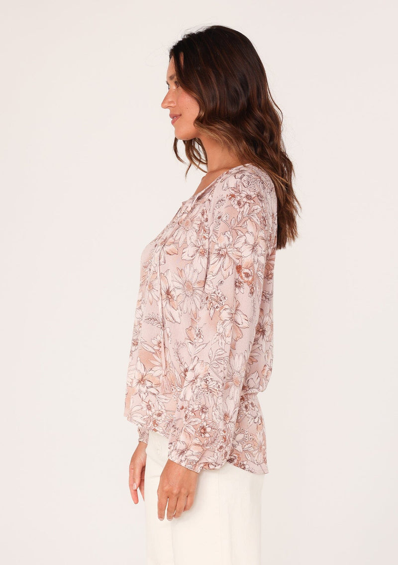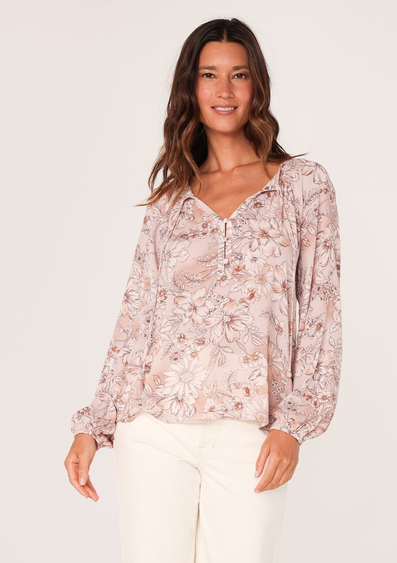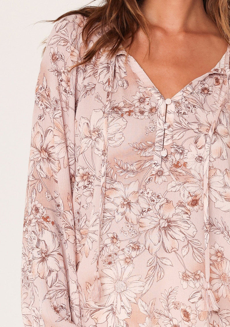 An ultra-feminine floral print elevates this classic boho blouse. Featuring voluminous long raglan sleeves, a flattering split v-neckline with tassel ties, and a delicate self-covered button front.