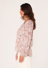 A fall boho blouse with a self-covered button front, designed in a pink floral print.
