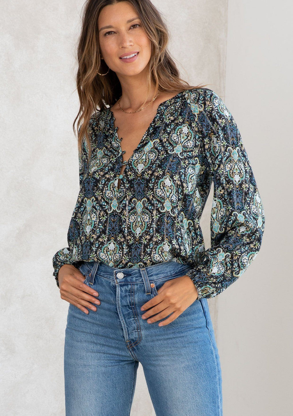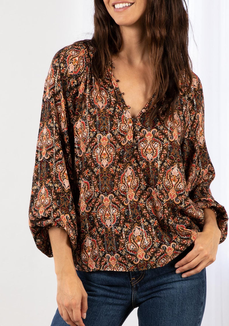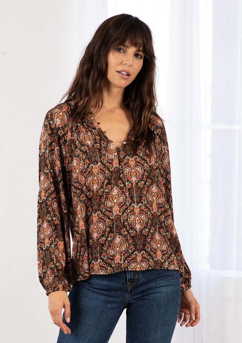 Shop NowEveryone's favorite classic peasant blouse is reimagined in light-catching gold lurex thread and a bohemian paisley print. Featuring voluminous long sleeves with an elastic cuff, a self-covered button front, and a button loop-trimmed v-neckline. An essential top for Fall that pairs effortlessly with denim.