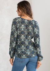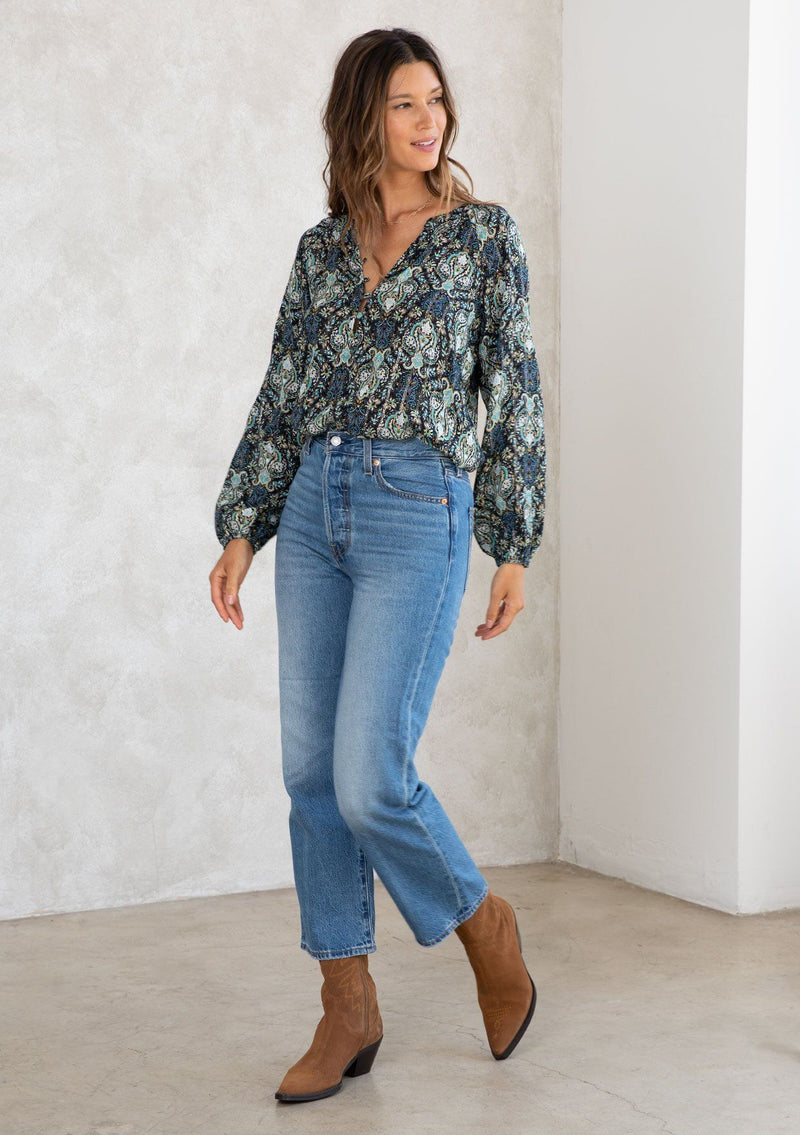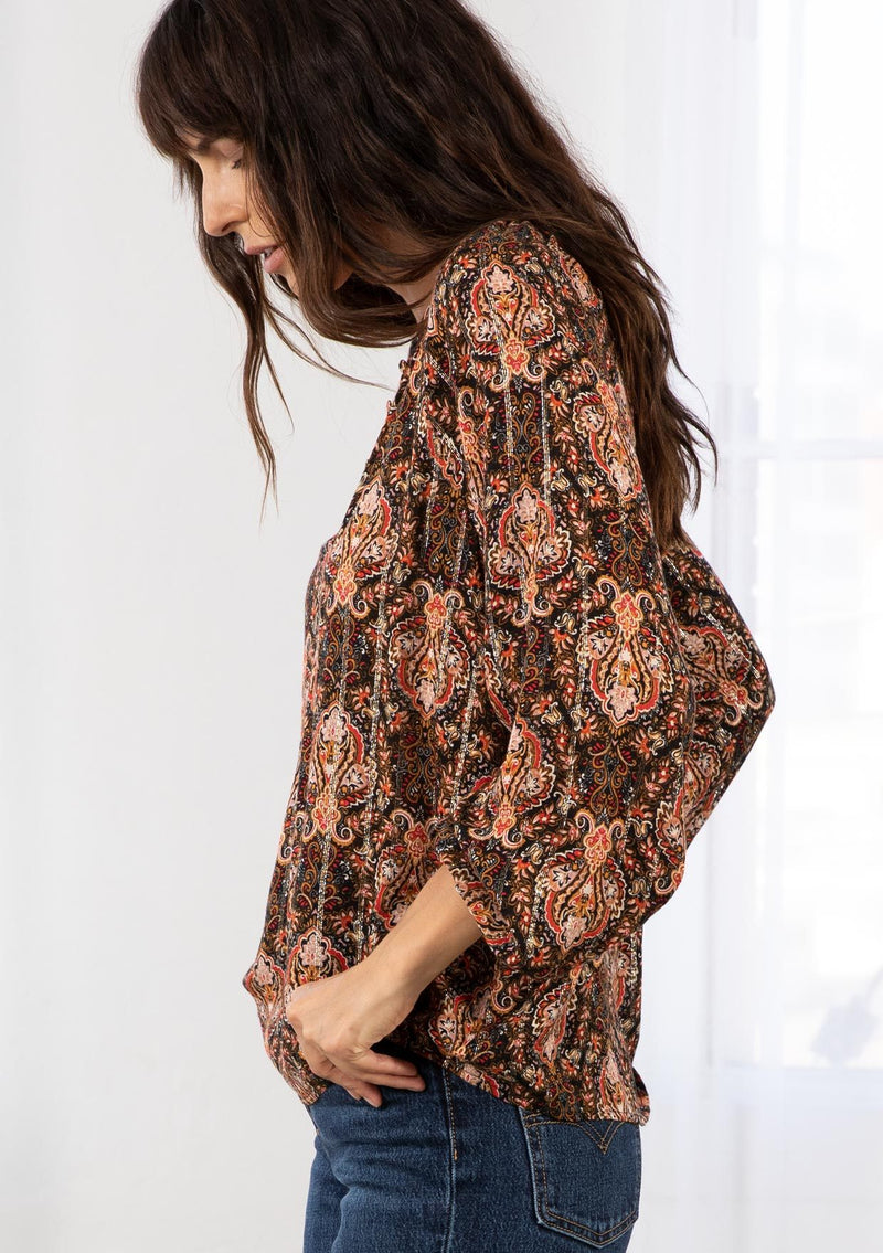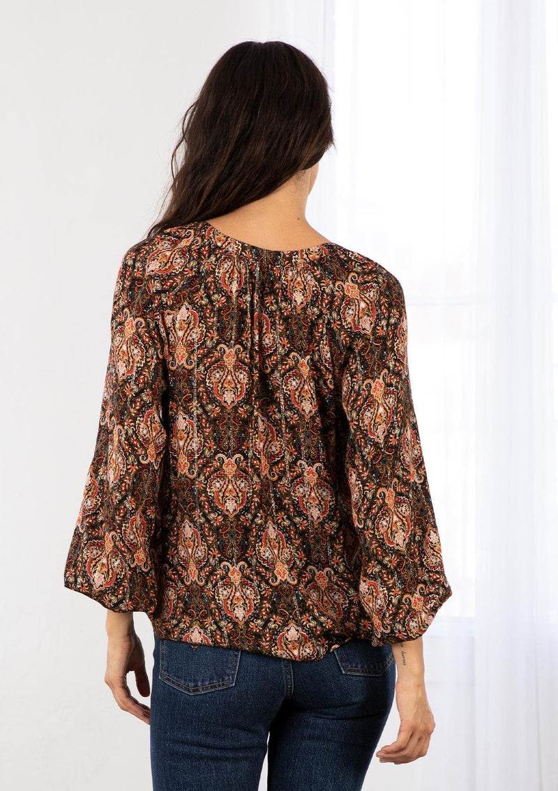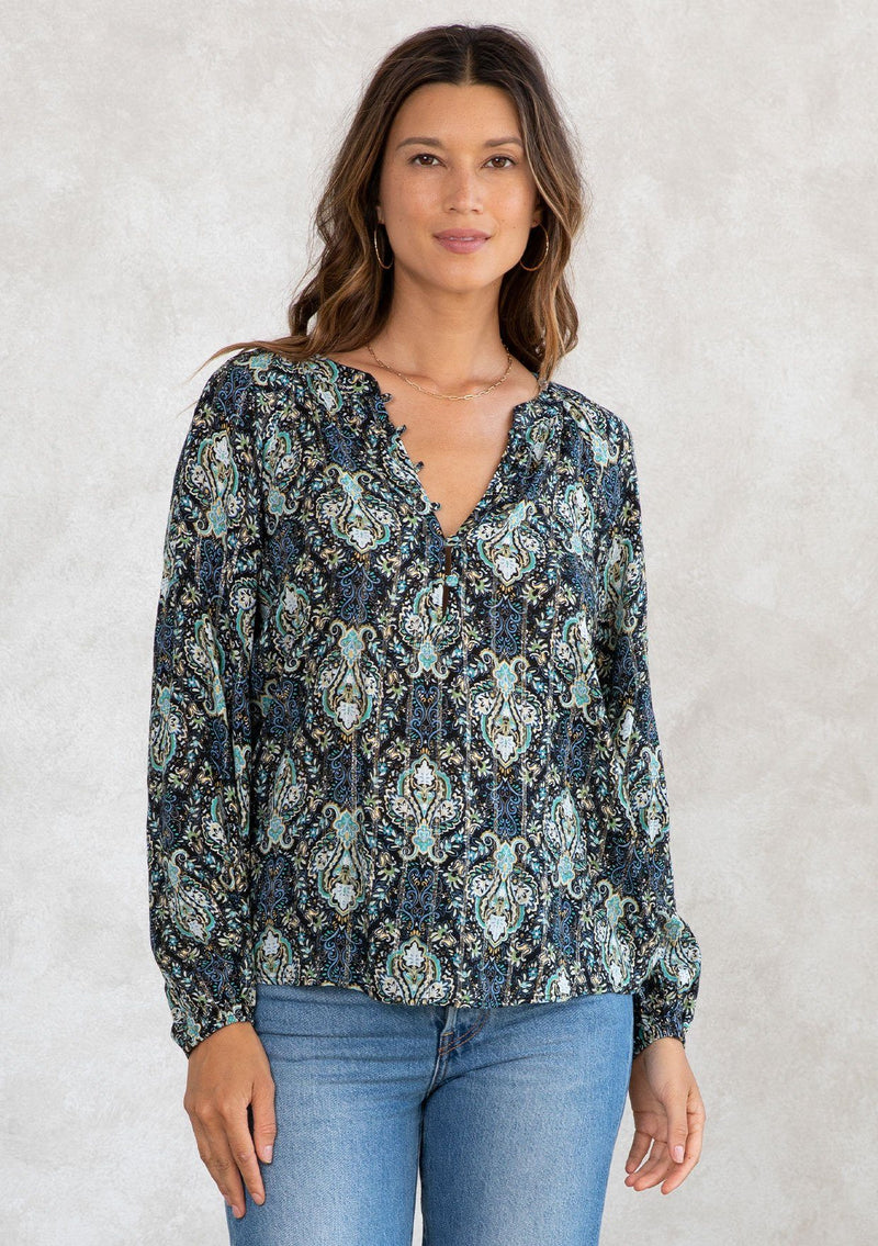 Shop NowEveryone's favorite classic peasant blouse is reimagined in light-catching gold lurex thread and a bohemian paisley print. Featuring voluminous long sleeves with an elastic cuff, a self-covered button front, and a button loop-trimmed v-neckline. An essential top for Fall that pairs effortlessly with denim.