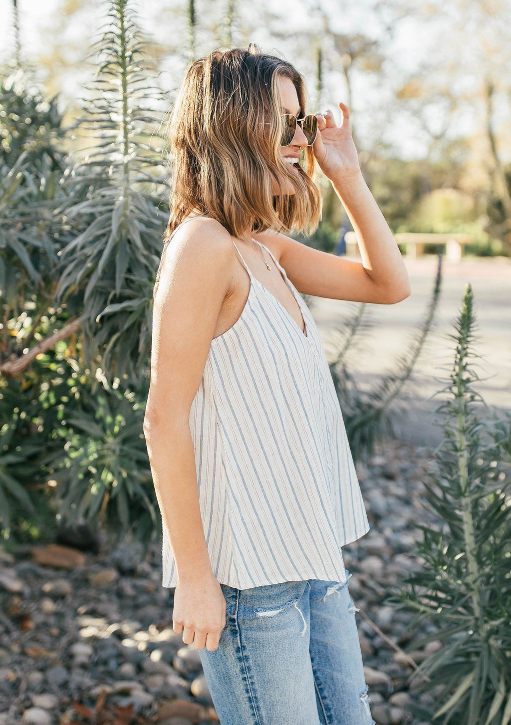A vintage-inspired striped button front tank top with an effortless, flowy fit. A year-round closet staple! Perfect tank for layering!