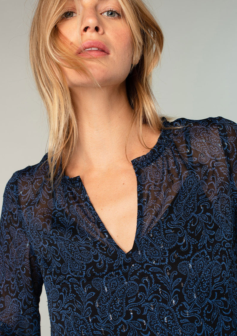 A flirty flutter sleeve adds a whimsical touch to this festive bohemian blouse. Designed in light-catching clip dot chiffon, with a paisley print and a relaxed, flowy silhouette. Pair it with trousers for special occasions, or dress it down with jeans and boots.