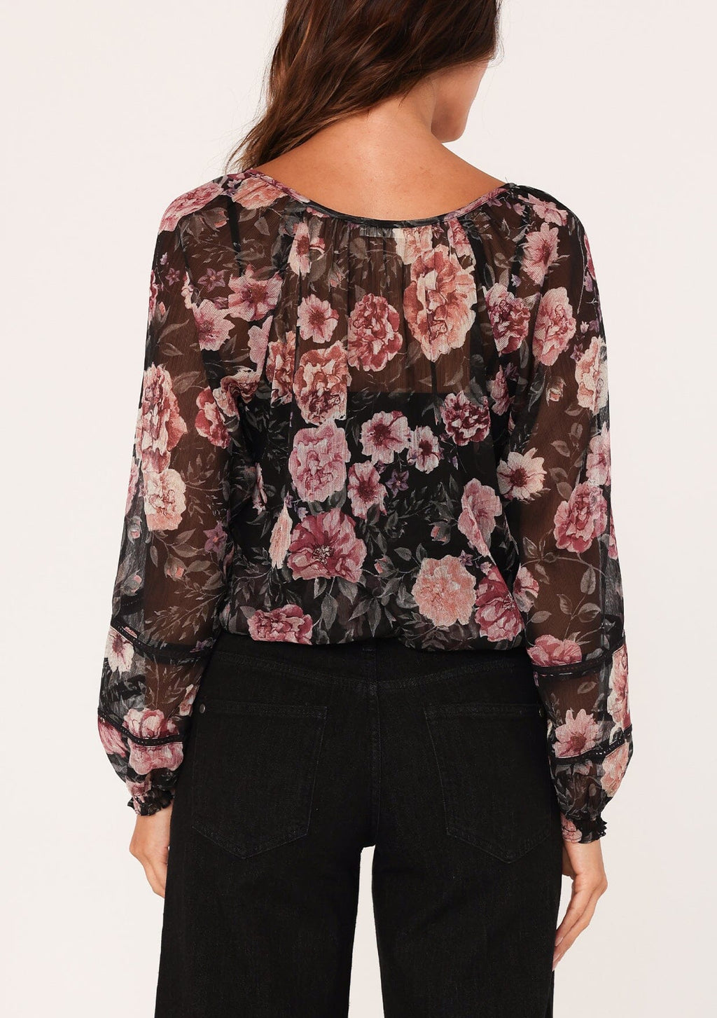 A dreamy floral print adds a romantic touch to this fall boho blouse. With sheer long raglan sleeves, a split v-neckline with ties, and a smocked elastic waist. A versatile style that can be dressed up with trousers and a heel, or dressed down with jeans.