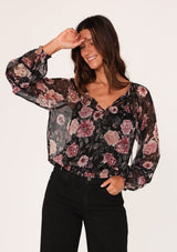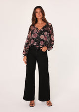 ![[Color: Black/Rose] A back facing image of a brunette model wearing a sheer chiffon bohemian blouse in a black and pink floral print. With sheer long sleeves, a split v neckline with ties, a smocked elastic waist, and lattice trim.](http://www.shoplovestitch.com/cdn/shop/files/I-15199WL-SJO-AN_BLACK-ROSE-B_160x.jpg?v=1748480284)