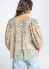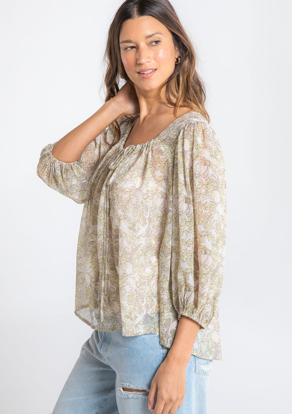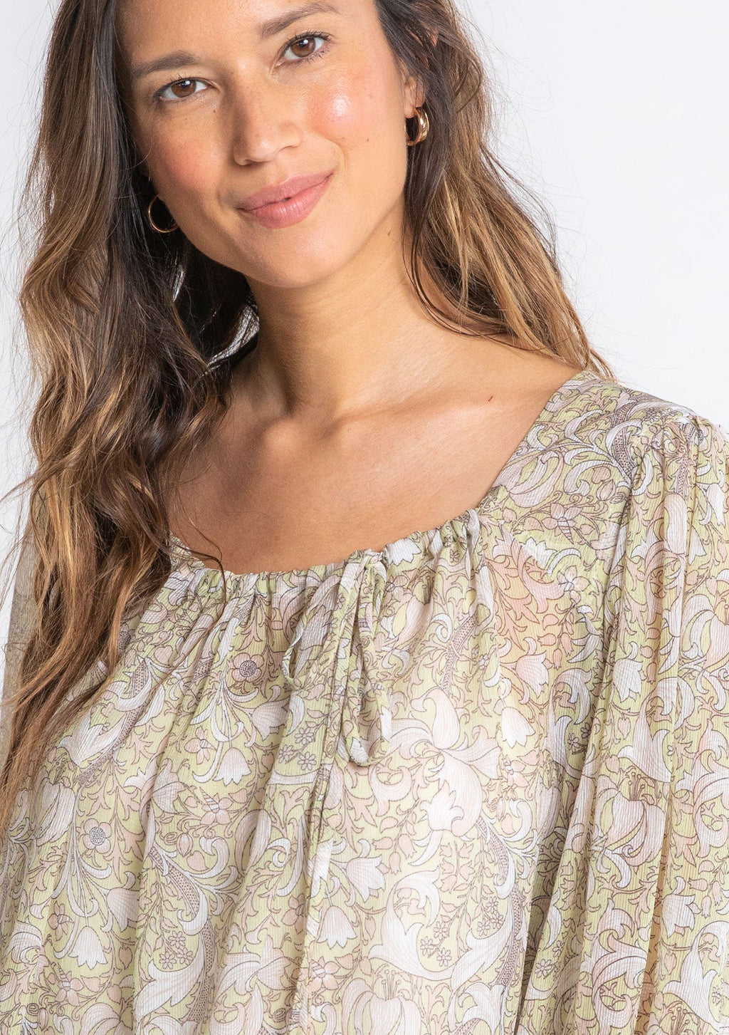 Delicate sheer chiffon meets classic bohemian paisley. This lightweight top is a romantic addition to your Spring wardrobe. Featuring a round neckline with a drawstring neckline and sheer 3/4 length voluminous sleeves.