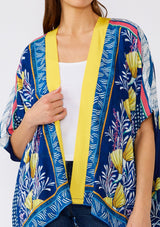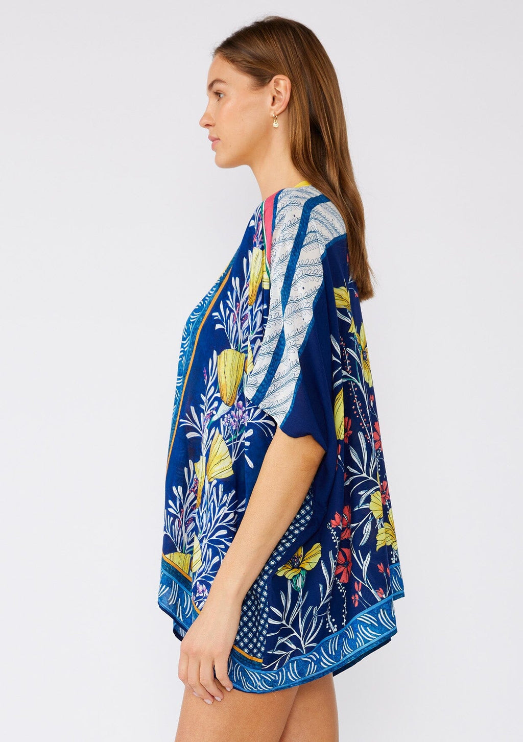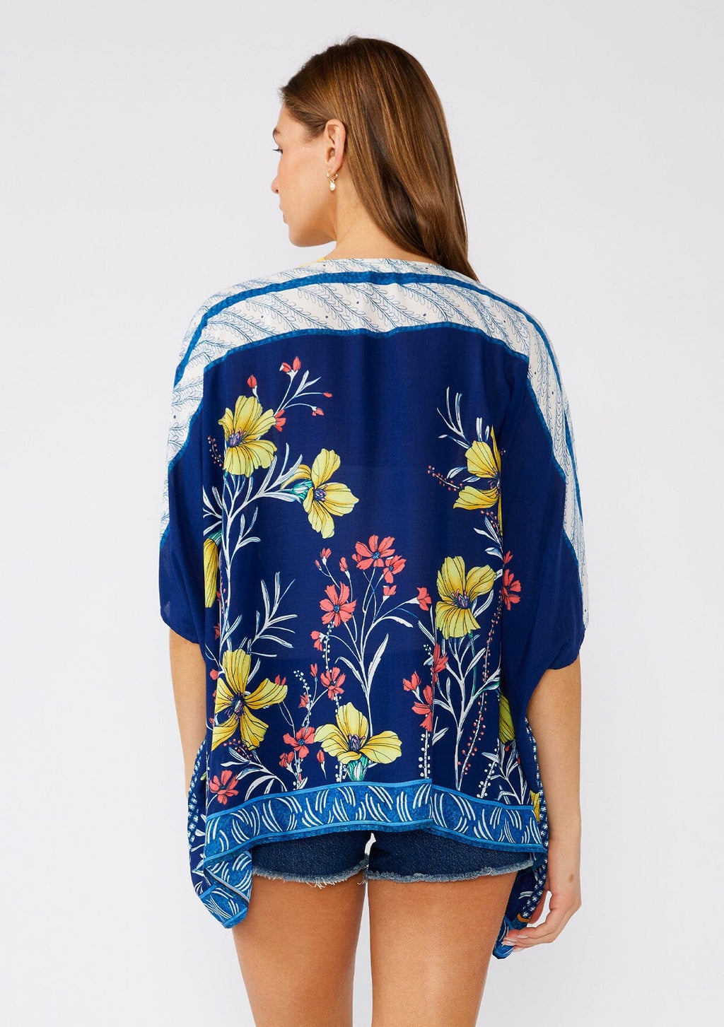An ultra-bohemian kimono top in a stunning navy blue and yellow floral print.