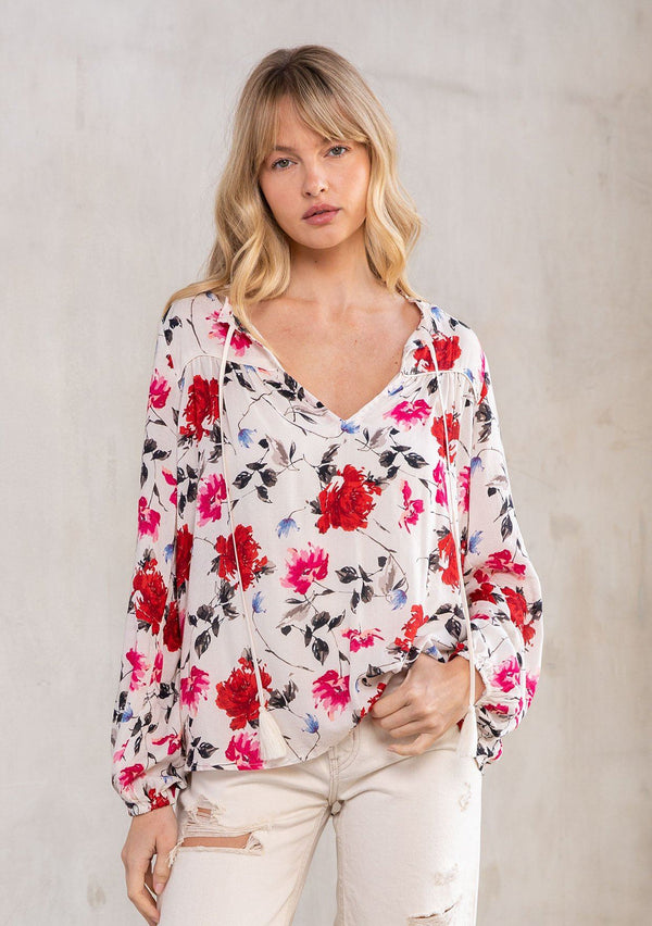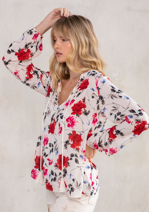 ![[Color: Natural/Dusty Peach] A side facing image of a blonde model wearing a floral print blouse crafted in a textured chiffon. Featuring a split v-neckline, button front, long sleeves, and a comfortable elastic hemline. Perfect for special occasions and casual outings.](http://www.shoplovestitch.com/cdn/shop/files/I-15225WL-SWU-CN-NATURAL-DUSTYPEACH-SIDE_{width}x.jpg?v=1748478281)