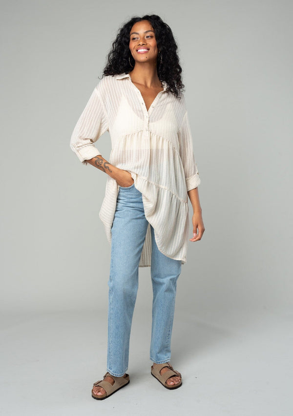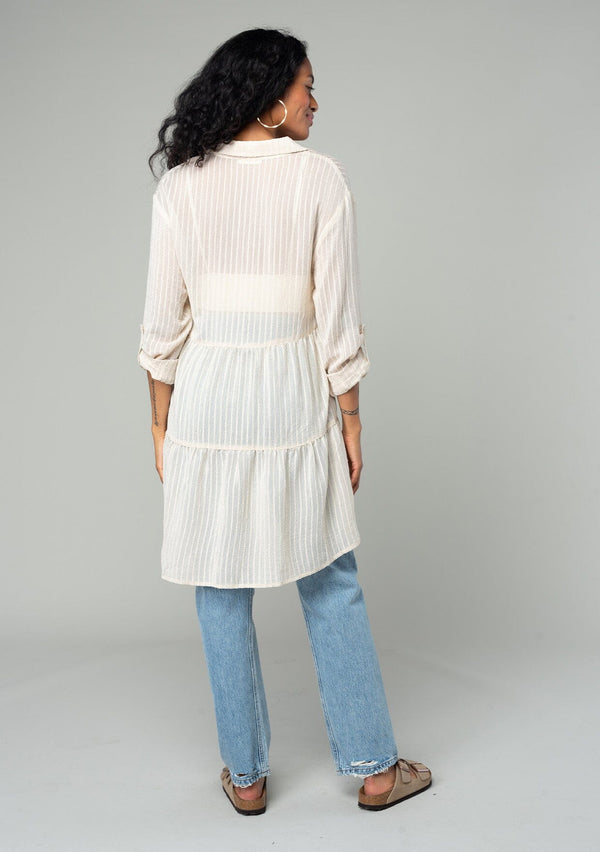 ![[Color: Oatmeal] A back facing image of a brunette model wearing a sheer cotton off white tunic top in a jacquard stripe. With long rolled sleeves, a button front, a collared neckline, an extra long length, and a self tie waist belt.](http://www.shoplovestitch.com/cdn/shop/products/I-13407W-SBO_OATMEAL-B_a2b85ab2-44e3-4ffe-a491-93daad2e29ba_{width}x.jpg?v=1748481341)