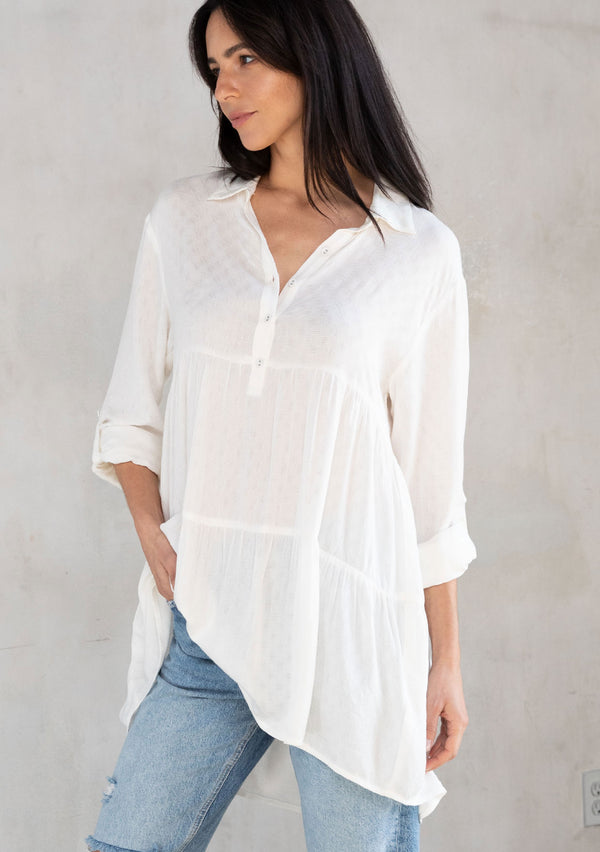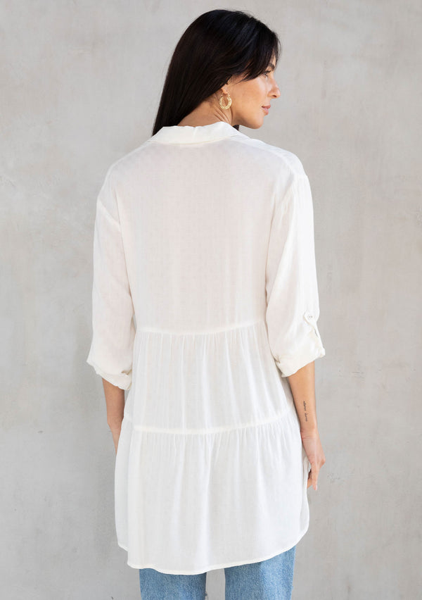 ![[Color: White] A back facing image of a blonde model wearing a bohemian white cotton tunic shirt in a textured jacquard. With long rolled sleeves and a button tab closure, a collared neckline, a button front, a self tie waist belt, side vents, a round hemline, and a back yoke detail.](http://www.shoplovestitch.com/cdn/shop/products/I-13407W-SAW_WHITE-D_35017093-ec55-4cd5-9302-7ef1e10cfa2b_{width}x.jpg?v=1748481457)