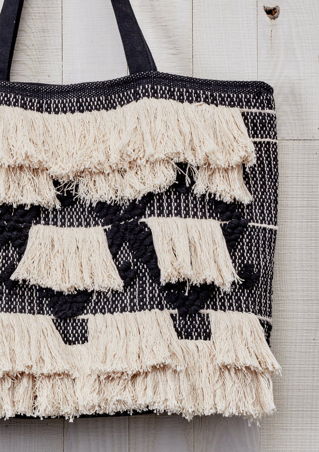 Shop NowThe ultimate bohemian oversize carpet tote bag with snap closure featuring tiered fringed pattern on the front and a quilted back with contrast stitching.