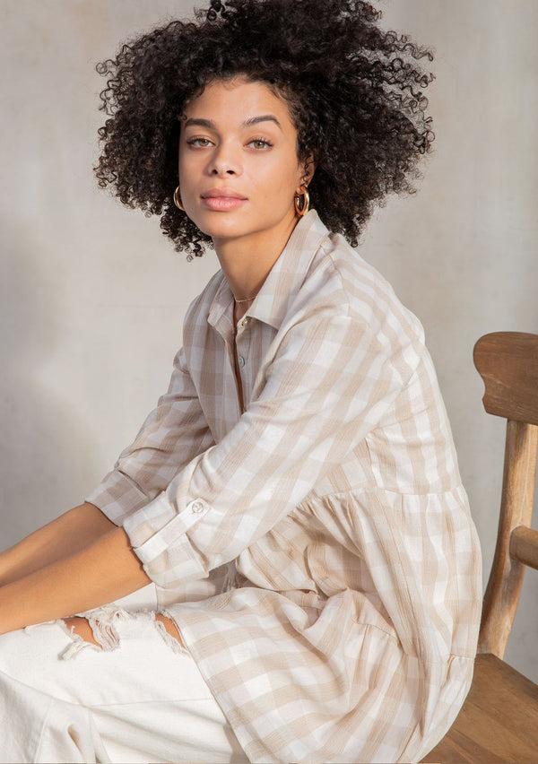[Color: Taupe/White] A model wearing a relaxed cotton blend beige large gingham button up tunic, with a rolled sleeve, a tiered body, and a long tunic length.[Color: Taupe/White] A model wearing a relaxed cotton blend beige large gingham button up tunic, with a rolled sleeve, a tiered body, and a long tunic length.