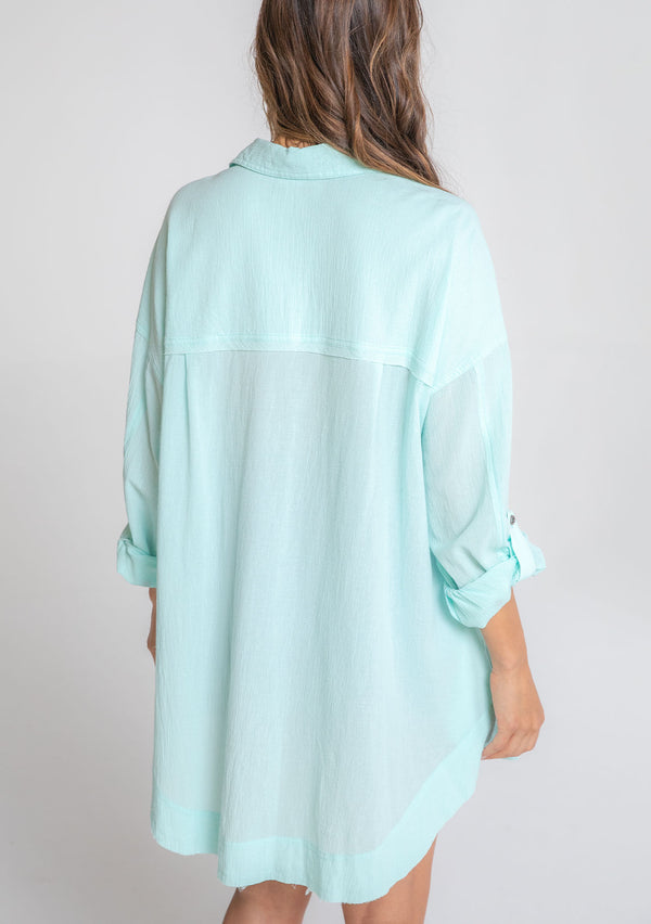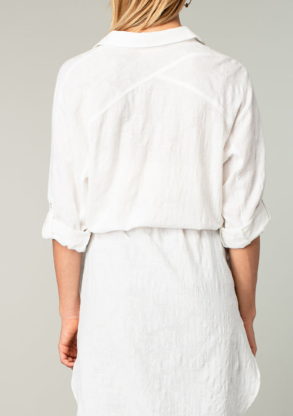 [Color: White] A back facing image of a blonde model wearing a bohemian white cotton tunic shirt in a textured jacquard. With long rolled sleeves and a button tab closure, a collared neckline, a button front, a self tie waist belt, side vents, a round hemline, and a back yoke detail. [Color: White] A front facing image of a blonde model wearing a bohemian white cotton tunic shirt in a textured jacquard. With long rolled sleeves and a button tab closure, a collared neckline, a button front, a self tie waist belt, side vents, a round hemline, and a back yoke detail.