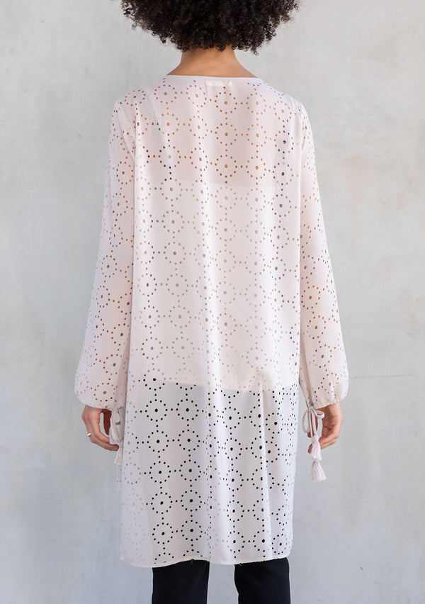 [Color: Bone] A model wearing a cream colored chiffon tunic top with gold metallic laser cut details throughout. With tassel tie wrist cuffs, a high low hemline, and a snap button front.[Color: Bone] A model wearing a cream colored chiffon tunic top with gold metallic laser cut details throughout. With tassel tie wrist cuffs, a high low hemline, and a snap button front.