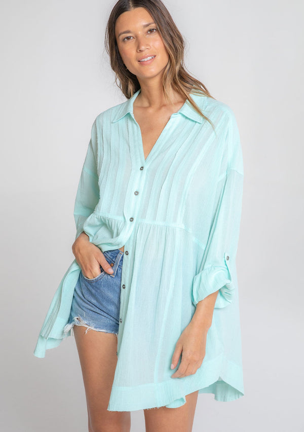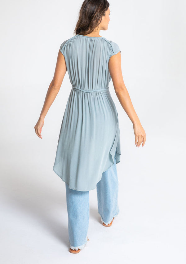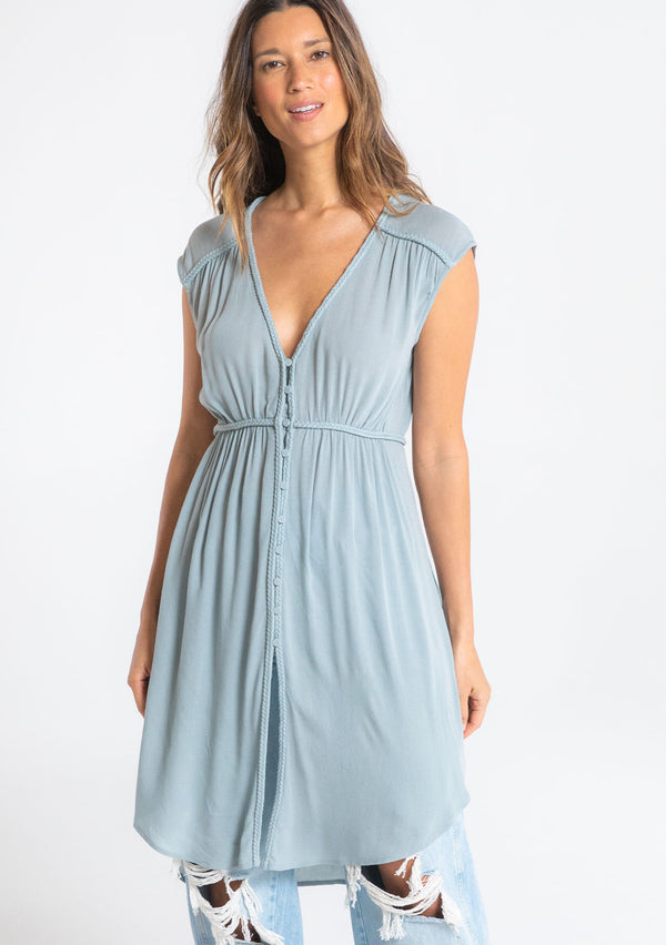 [Color: Blue Fog] A model wearing a floaty blue bohemian sheer cap sleeve tunic top with button front and braided trim. [Color: Blue Fog] A model wearing a floaty blue bohemian sheer cap sleeve tunic top with button front and braided trim.