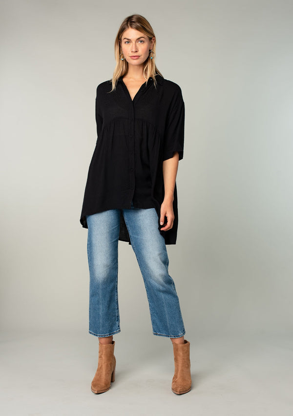 [Color: Black] A model wearing a flowy black oversized collared tunic top.[Color: Black] A model wearing a flowy black oversized collared tunic top.