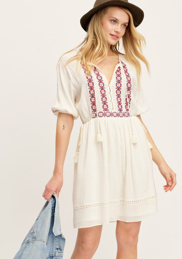 [Color: Vanilla/Sand] A model wearing a flowy bohemian off white peasant top with voluminous long sleeves, embroidered sleeve details, and a tassel tie v neckline. [Color: Vanilla/Sand] A model wearing a flowy bohemian off white peasant top with voluminous long sleeves, embroidered sleeve details, and a tassel tie v neckline.