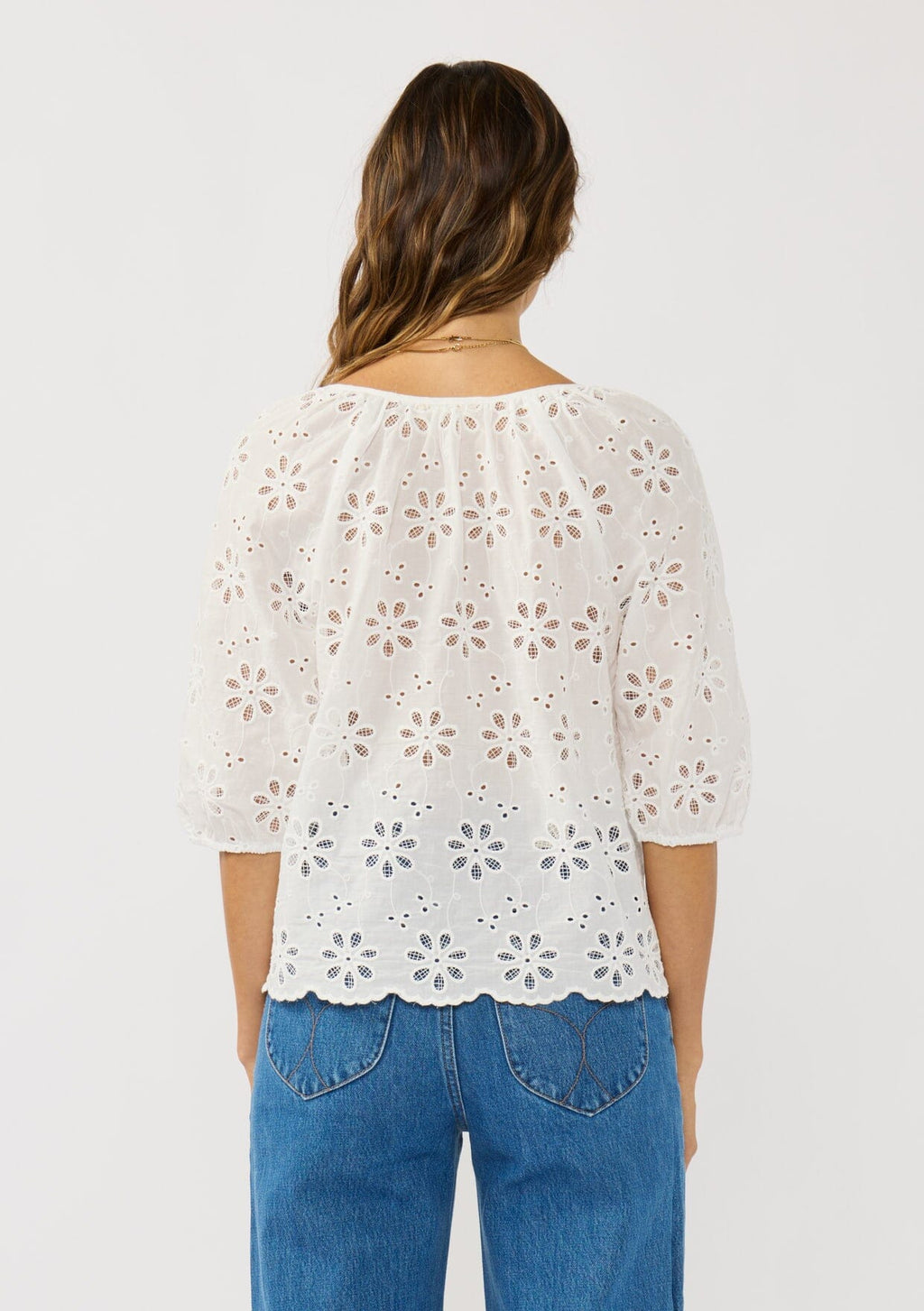 This classic top stands out with its effortless fit and delicate floral eyelet design, making it a spring essential inspired by the season’s first blooms. Designed with a chic button-front detail, half-length sleeves, and a delicate scalloped hem, this breezy piece pairs well with denim for a relaxed everyday look.