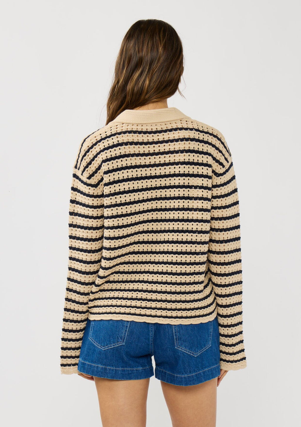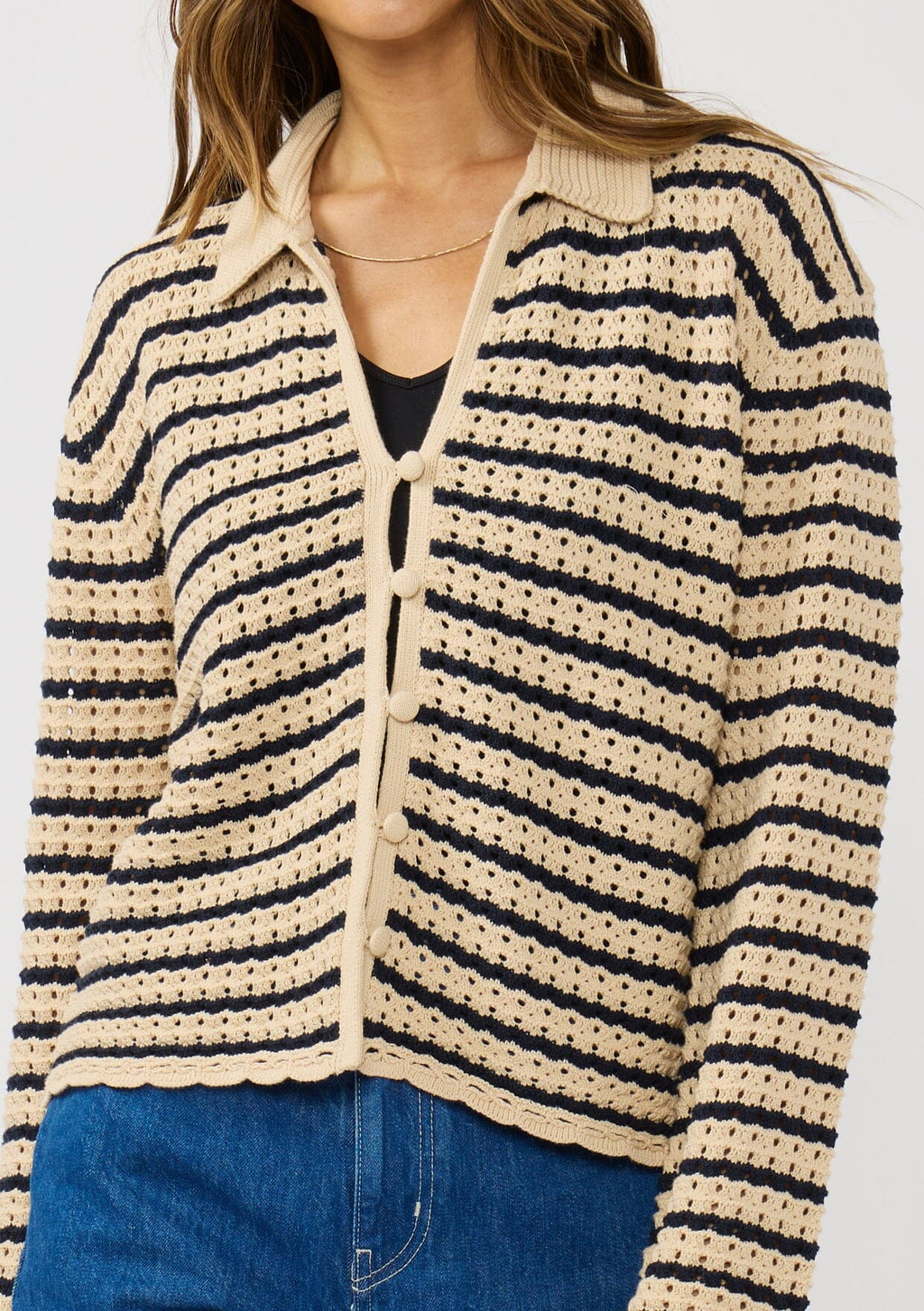 Add coastal stripes to your wardrobe with this easygoing cardigan. Featuring a pointelle knit, collared neckline, and long sleeves, it’s perfect for casual days or beach outings, offering a comfortable, effortless layer for all-day wear.