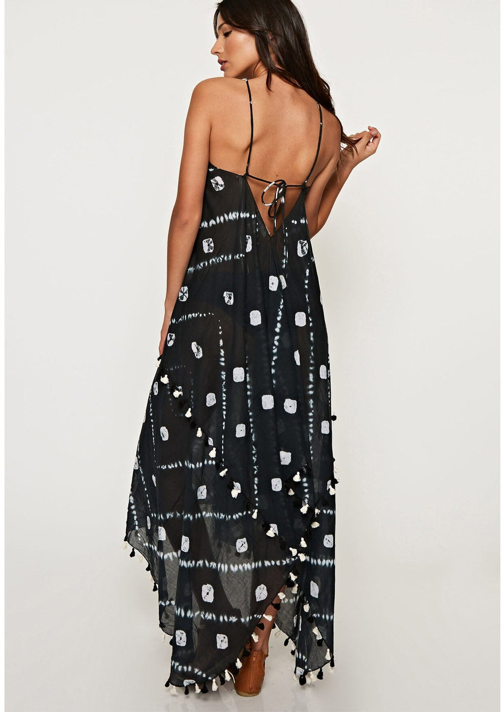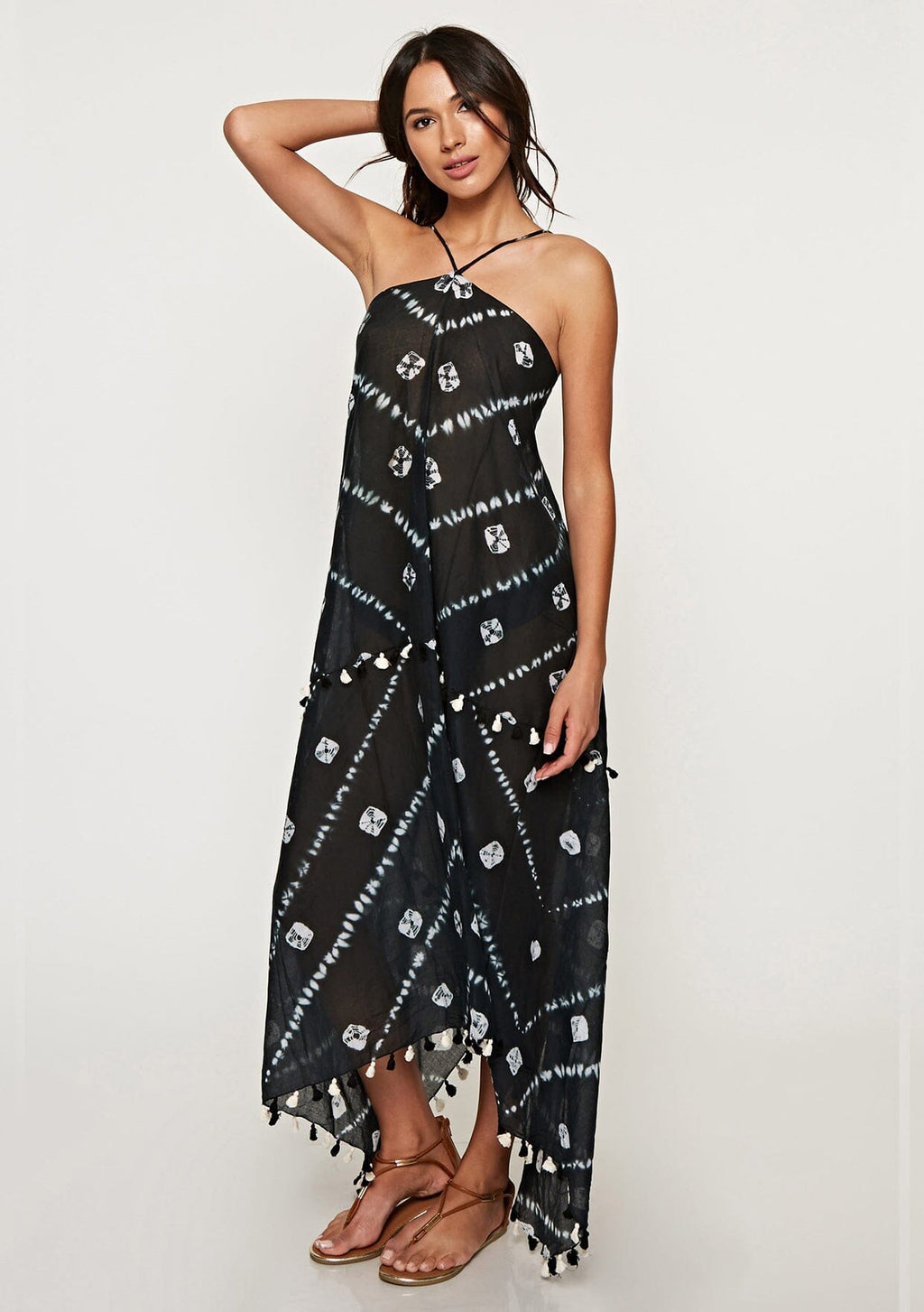 Warm weather is calling and we're ready with our tie dye scarf dress. Featuring a flirty handkerchief hemline, front keyhole detail, and sexy strappy back, this sheer cotton dress is perfect thrown over your swimsuit.