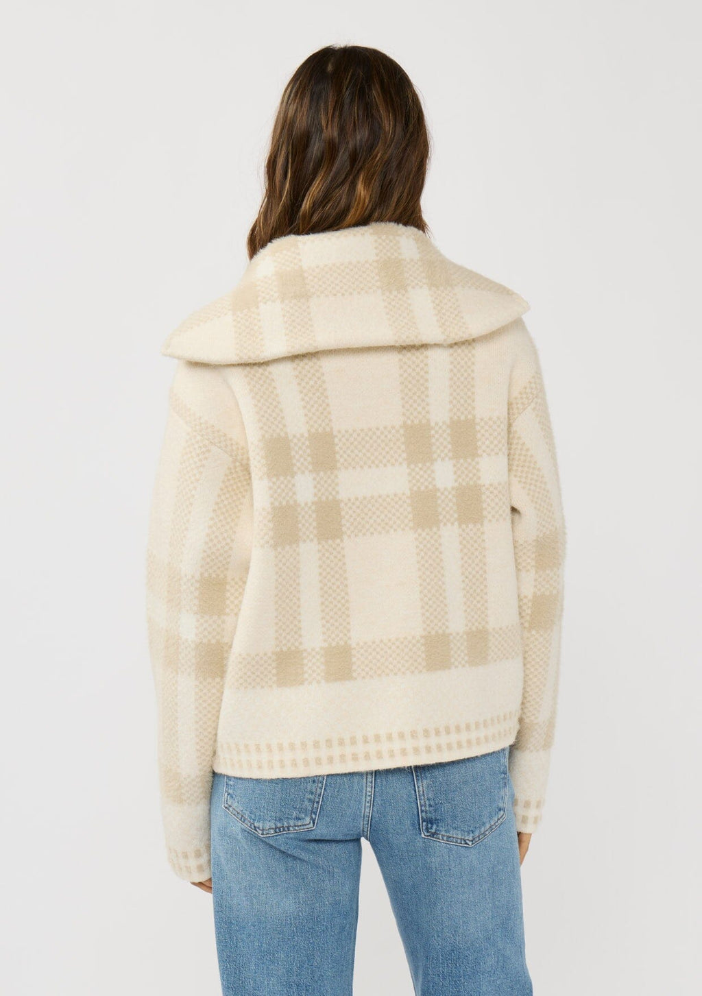 A cozy fall jacket featuring a soft, classic plaid pattern.