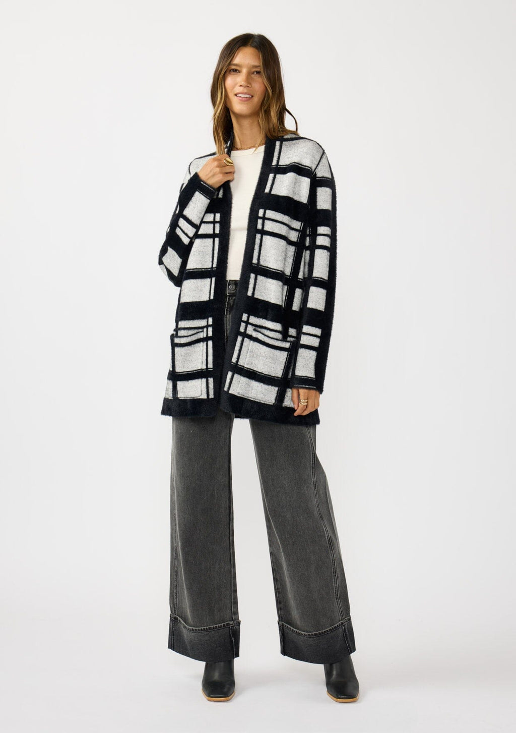 An effortlessly cozy mid-length cardigan featuring a timeless black and grey plaid pattern.