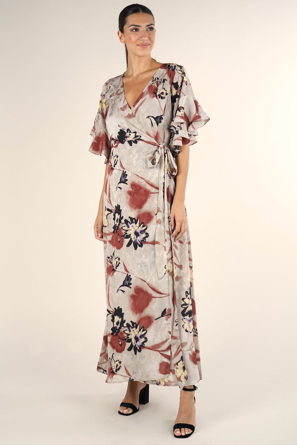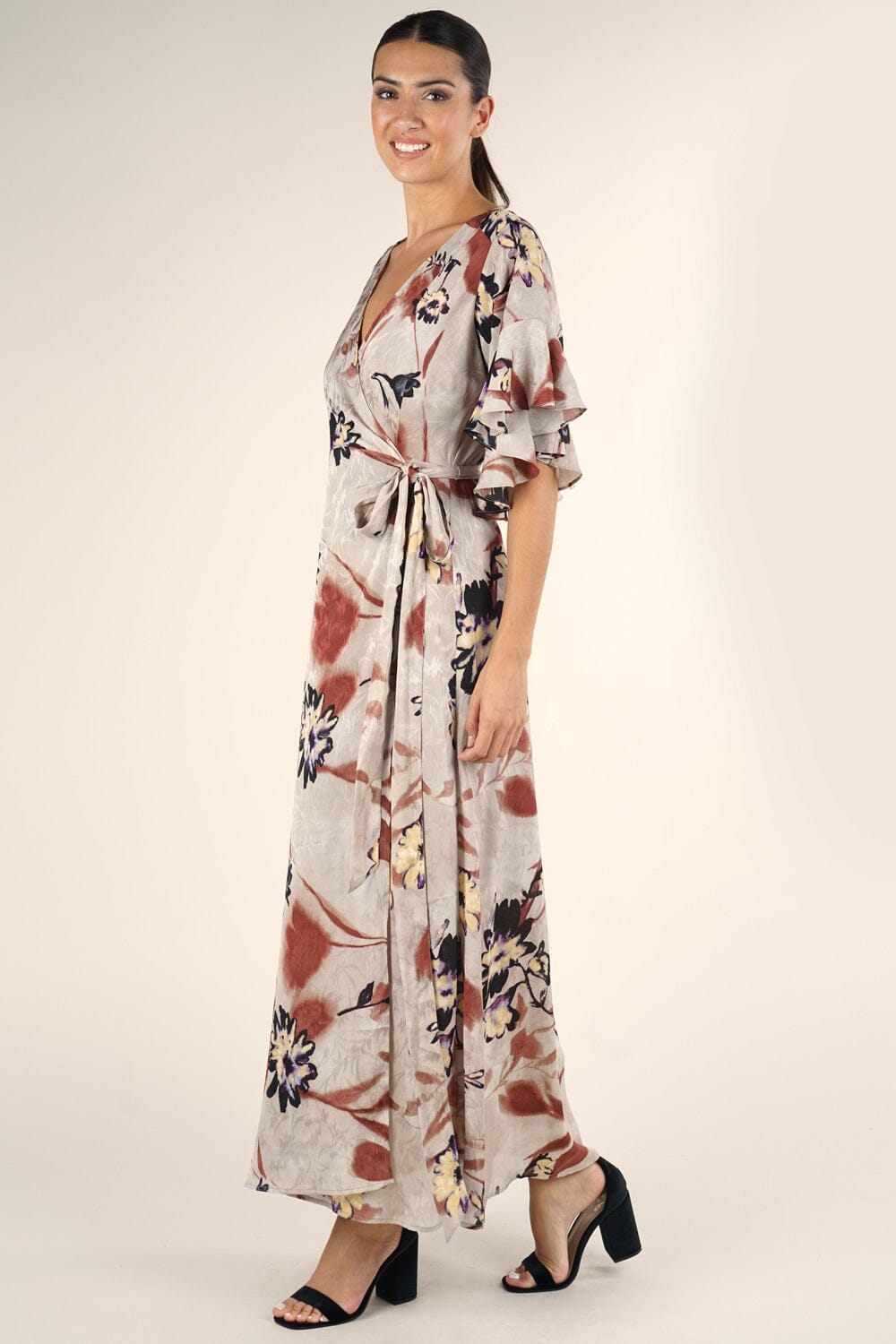 Treat yourself to this gorgeous floral wrap maxi dress! The flattering 1/2 length tulip sleeves have a pretty ruffle hem, while the belted wrap waist is slimming and flattering. This beautiful and ultra-feminine wrap dress is elegant enough to wear to a wedding and playful enough for a date night!