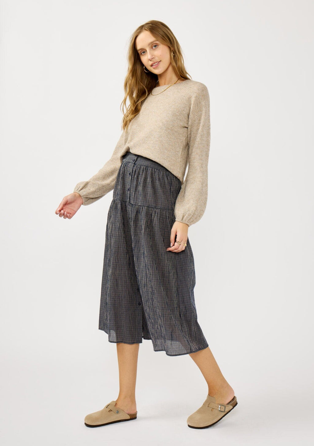 ![[Color: Navy/Taupe] A detail image of a blonde model wearing a navy gingham skit with a button front and a smocked elastic waist at the back. A boho fall skirt paired with a sweater for the fall season.](http://www.shoplovestitch.com/cdn/shop/files/LOVESTITCH_20250418_339_160x.jpg?v=1748477071)