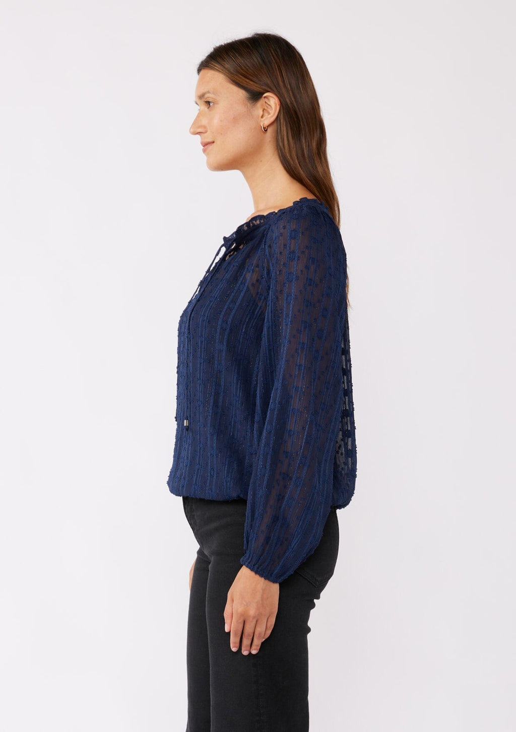 ![[Color: Navy] A brunette model wearing a navy shimmer blouse crafted on textured chiffon. With a split v neckline with ties, long sleeves, and an elastic hem. The perfect special occasion blouse for formal events or holidays.](http://www.shoplovestitch.com/cdn/shop/files/I-15152WL-SVT_NAVY-D_160x.jpg?v=1748478765)