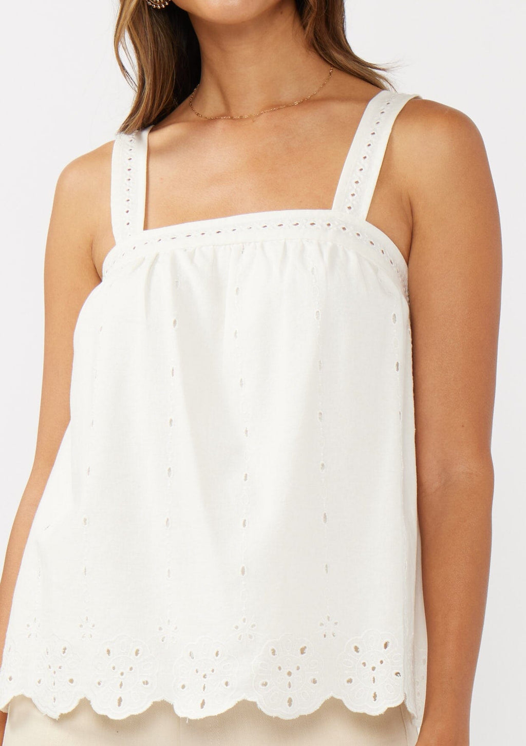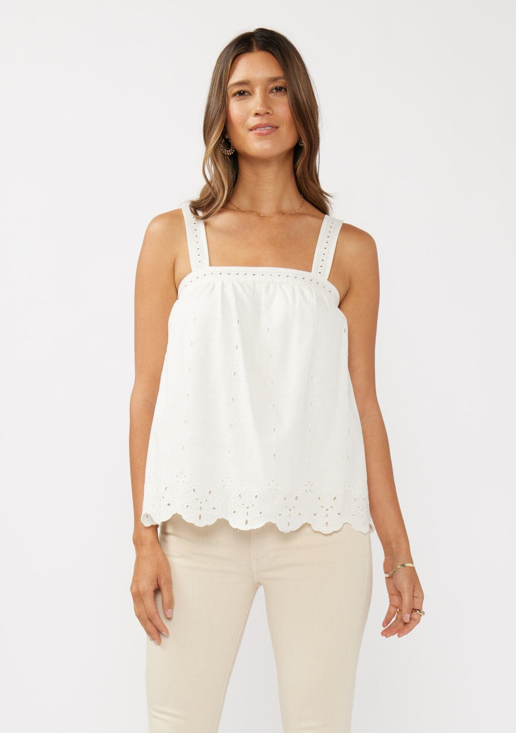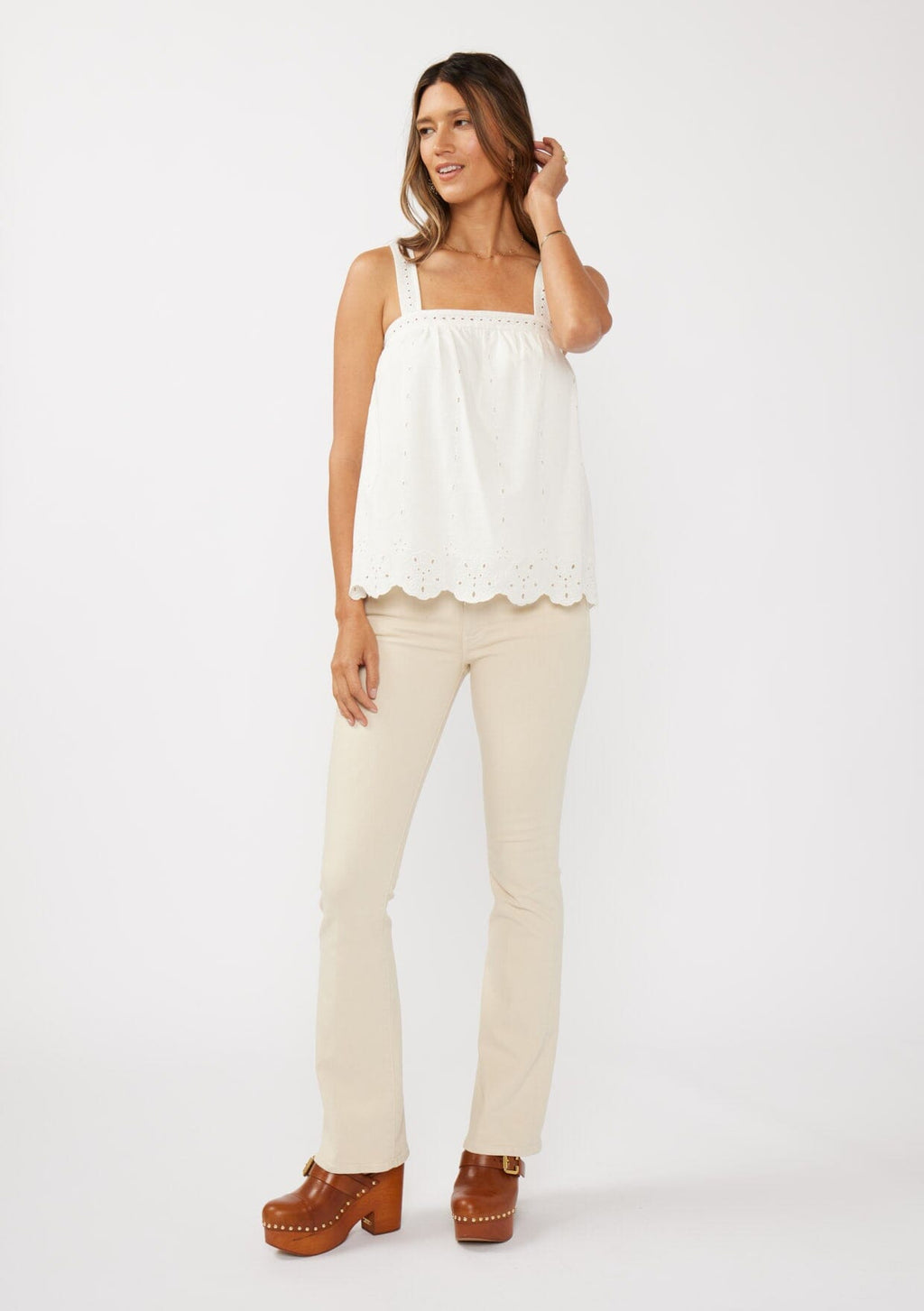 Shop The SaleThis effortlessly chic bohemian tank top is the perfect addition to your Spring and Summer wardrobe. With all-over eyelet details and a scalloped hemline, it brings a touch of texture and dimension to any outfit. Its breezy, relaxed silhouette ensures ultimate comfort, whether you’re enjoying brunch or strolling along the beach.