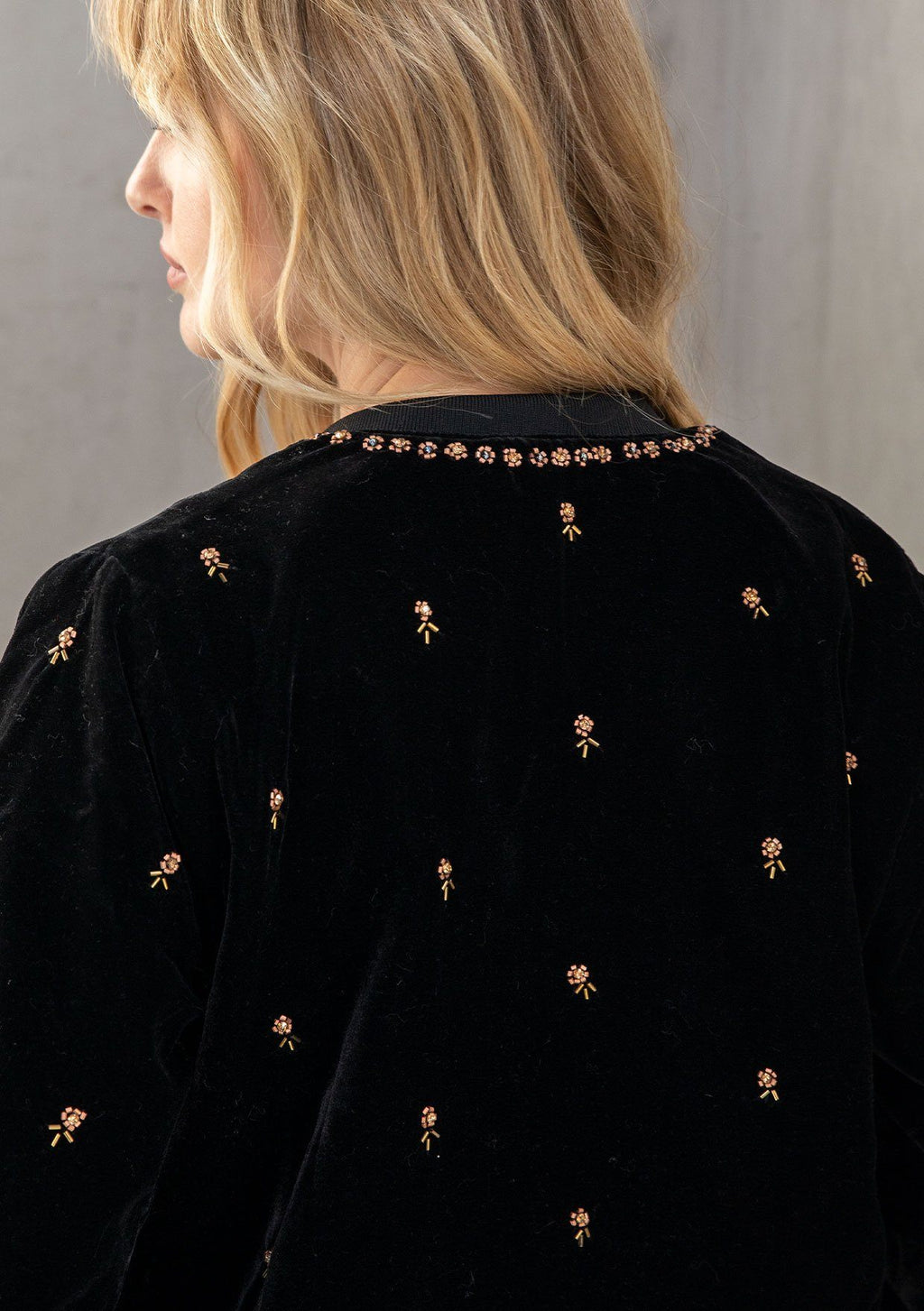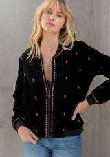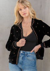 A cool and bohemian chic velvet bomber jacket, made for chilly days and nights. Featuring essential side pockets and floral beaded detailing throughout. Pair this super soft layering staple with jeans and a tee for an easy everyday look!