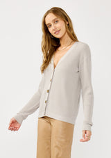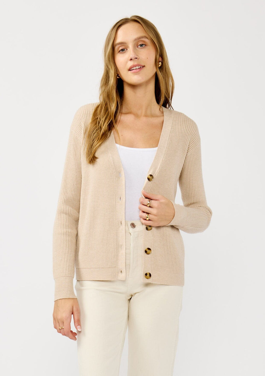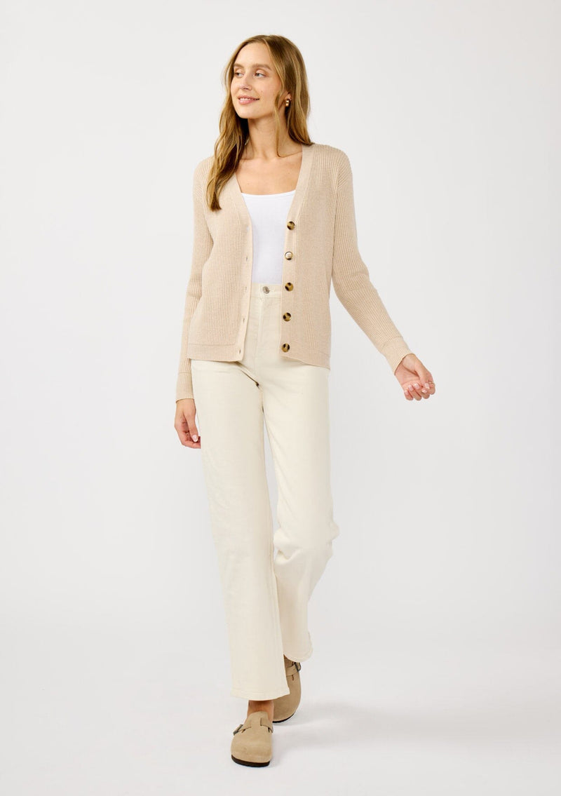 Effortless and timeless, this lightweight waffle knit cardigan is your go-to for easy layering. Designed with a timeless v-neckline and a chic button front, it’s the kind of piece that goes with everything. From laid-back mornings to polished office days, its clean finish and versatile design make it a wardrobe favorite.
