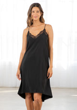 Shop The SaleA beautiful mid-length slip dress. Featuring an intricate lace trim v-neckline and racerback. Warm it up for Fall with a cozy sweater layered on top or a long sleeve tee underneath.
