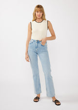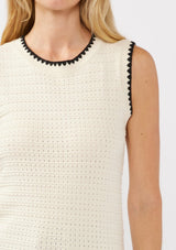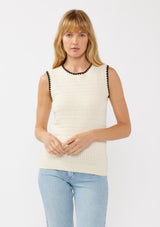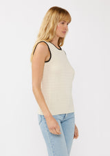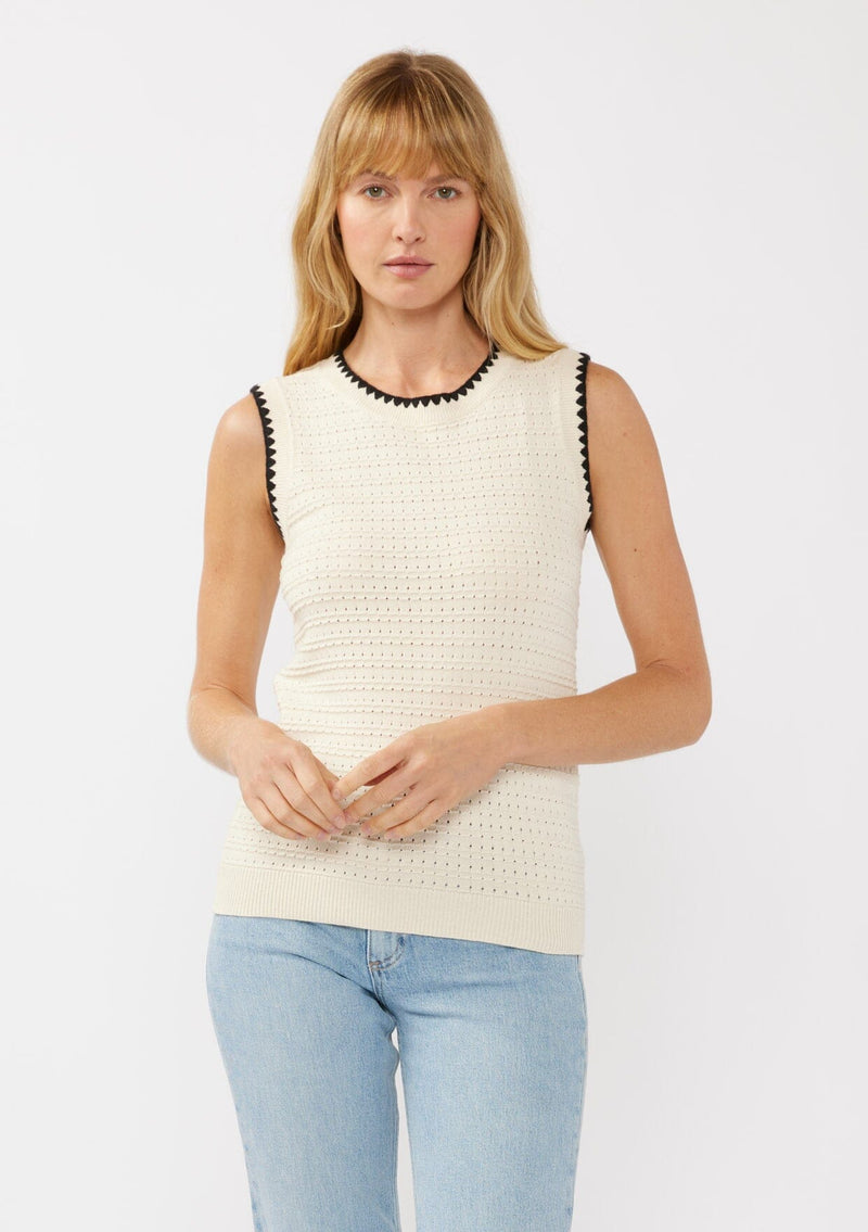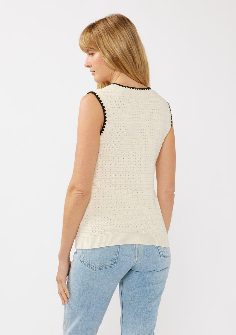 Embrace laid-back sophistication with this dreamy tank sweater vest, your go-to for an elevated resort vibe. Made from breathable cotton, it’s perfect for layering or wearing solo when the sun’s out. The playful contrast trim adds the right touch of boho while the striped pointelle knit keeps it cool and laid-back. Perfect for pairing with relaxed denim bottoms or cut-off shorts for an effortlessly chic look.