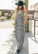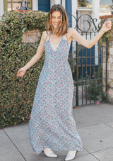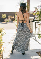 Timeless and boho-chic, this floral maxi dress features a classic ditsy print, open back with double tie straps, halter neckline, and convenient side pockets. This breezy, lightweight summer dress is perfect for beach days, festivals, or casual everyday wear. Pair with boots or sandals for an effortless bohemian look!