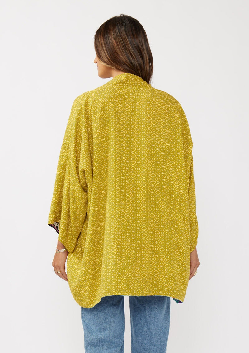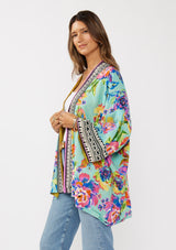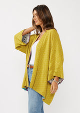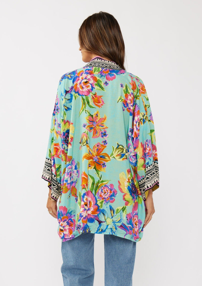 A chic bohemian kimono featuring a reversible design with a vibrant tropical print.
