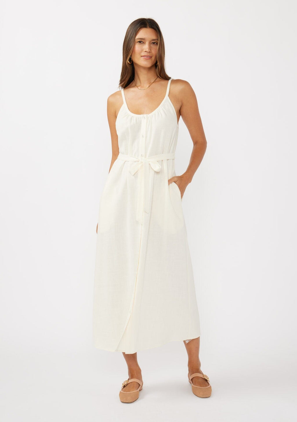 ![[Color: Tea] A front facing image of a blonde model wearing an off white sleeveless maxi dress with an adjustable waist belt, button front, a scoop neckline, and side pockets. A relaxed fit maxi dress with a linen blend texture.](http://www.shoplovestitch.com/cdn/shop/files/Lovestitch_12132024_471_160x.jpg?v=1748478159)