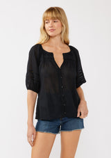 Crafted from light, sheer cotton, this puff sleeve top is a warm-weather must-have. With its pleated yoke and sleek button-front design, it adds an elevated touch to any outfit. Pair it with denim and classic leather sandals for an effortlessly chic look, perfect for any occasion.