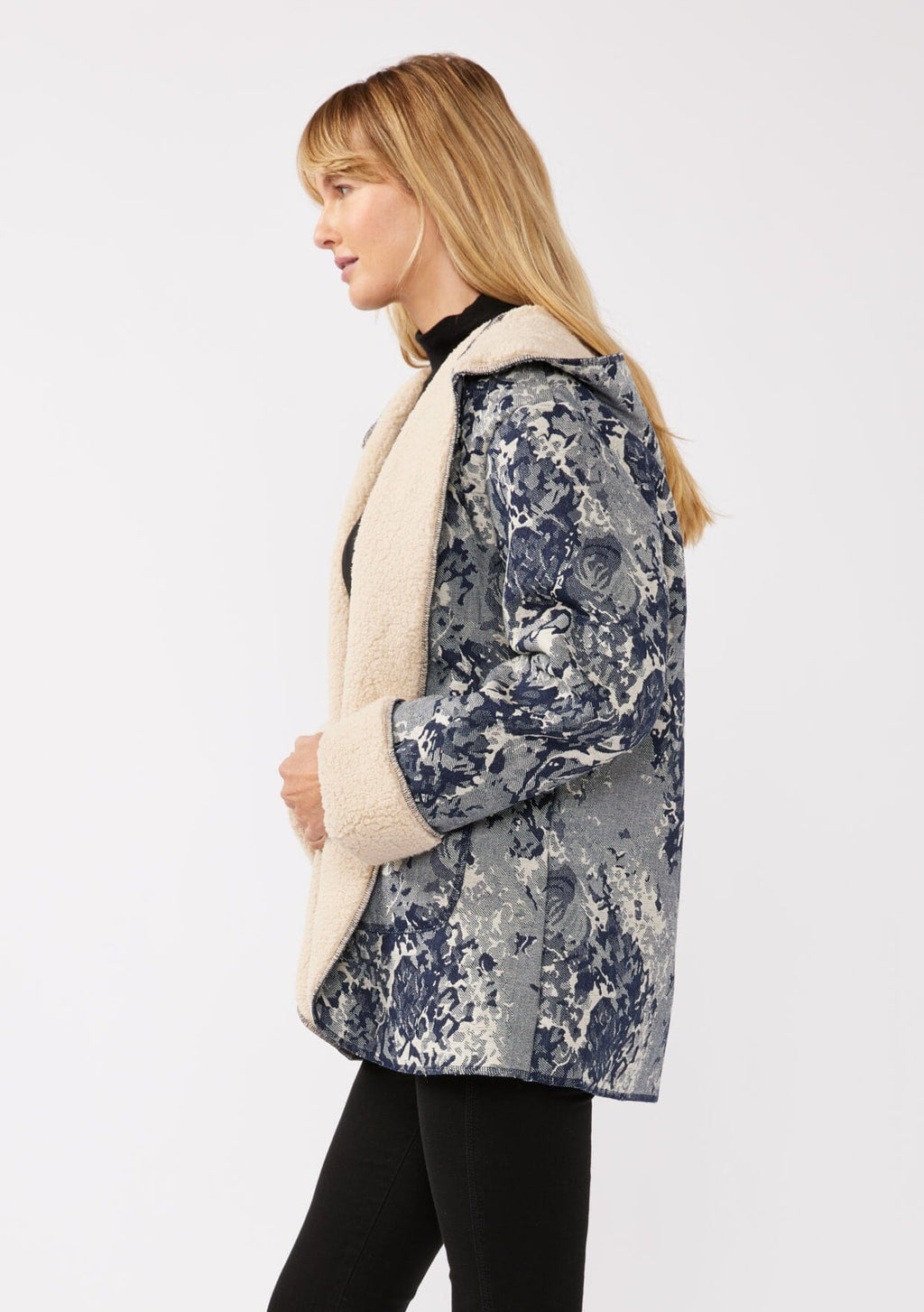 A fun statement jacket in a floral denim print with faux shearling lining.