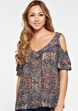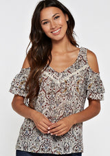 Shop The SaleA boho beauty made for golden hour and beyond. This floral-printed cold shoulder top features romantic ruffle sleeves and delicate lattice trim inserts for that extra touch of charm. With its relaxed, flowy fit, it's the perfect day-to-night piece—effortless, feminine, and made to move with you.