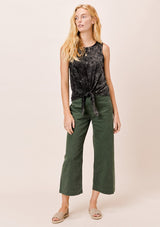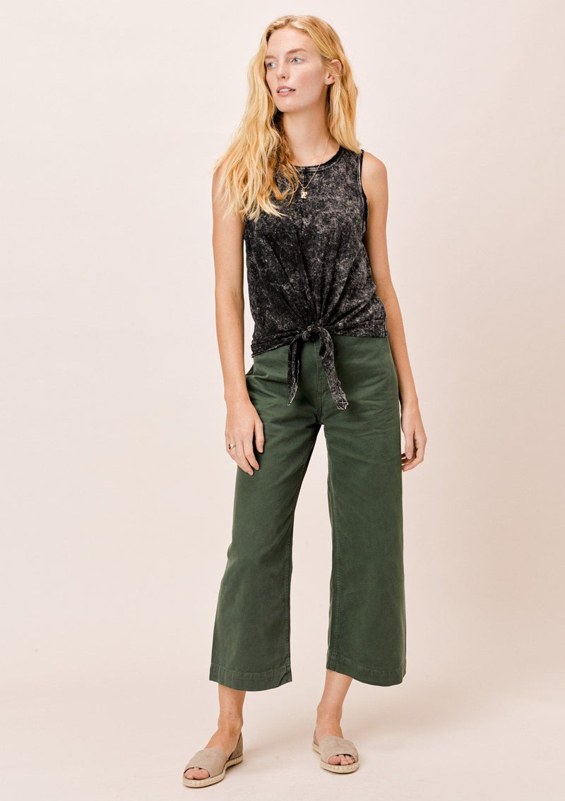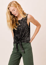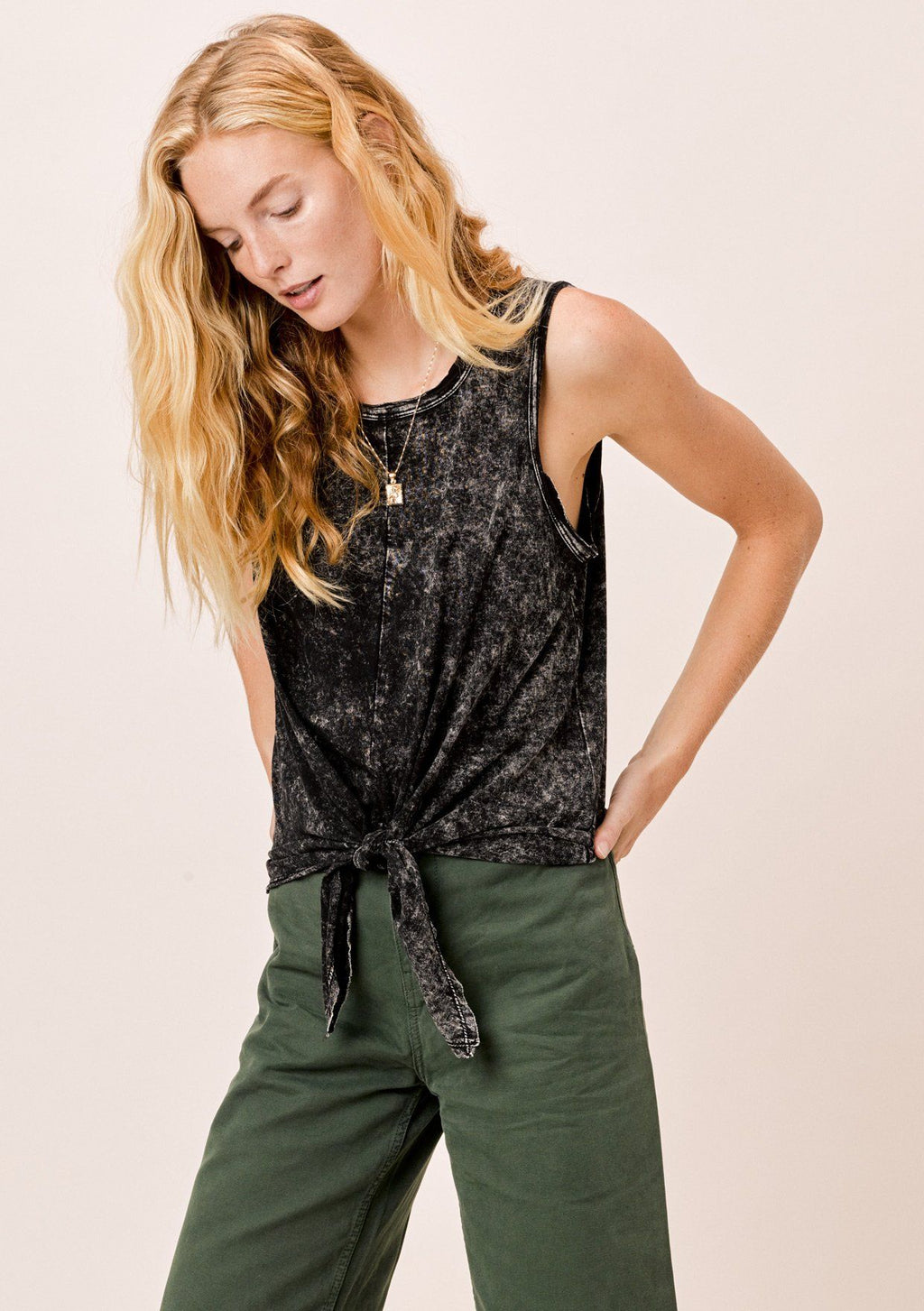 Stay breezy in our relaxed snow wash tank top! A casual tie front adds definition to this easy everyday style. The unfinished hem and center front seam detail give this tank top an effortlessly cool vibe.